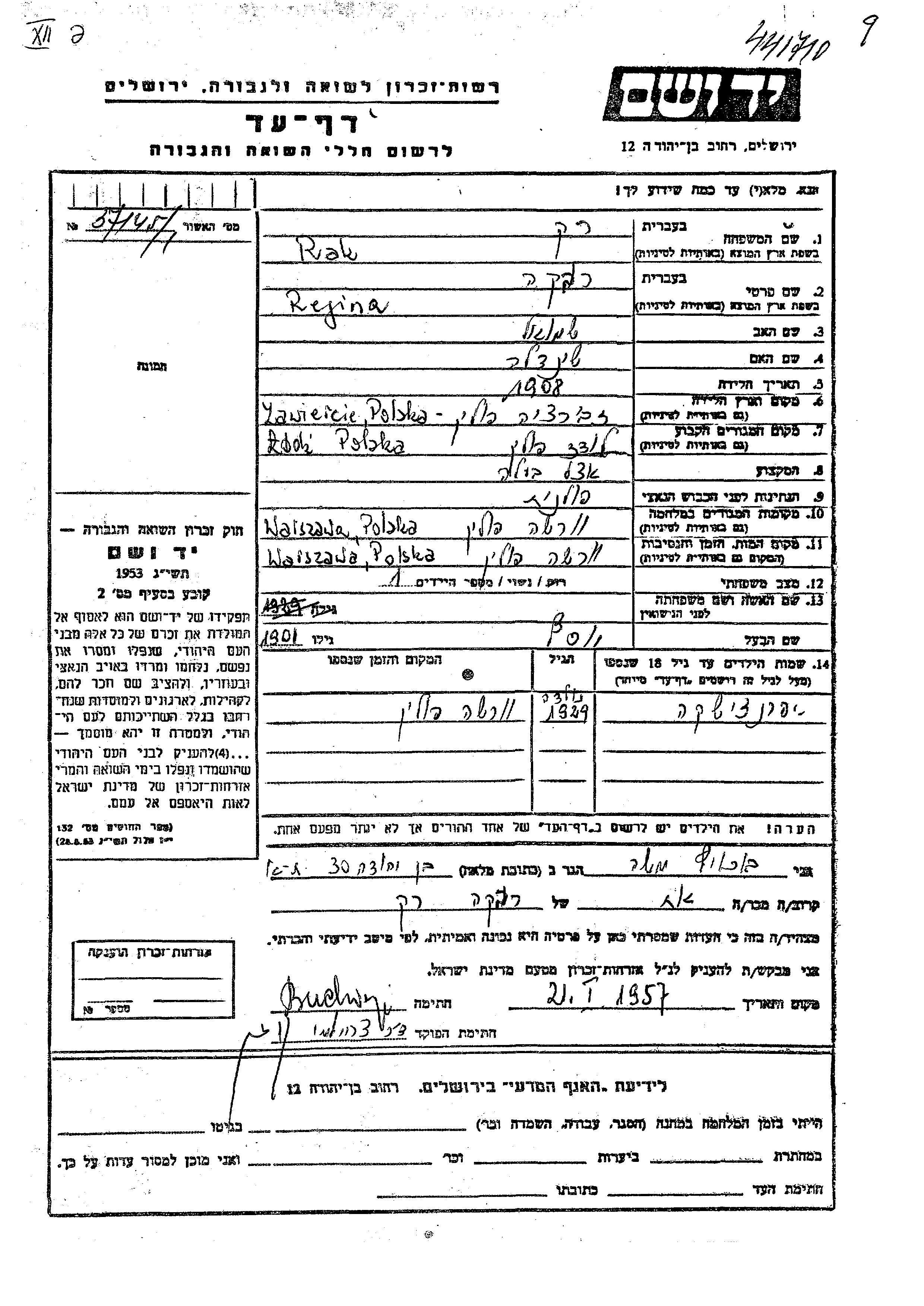 Яд Вашем - Листы свидетельских показаний Мемориального фонда