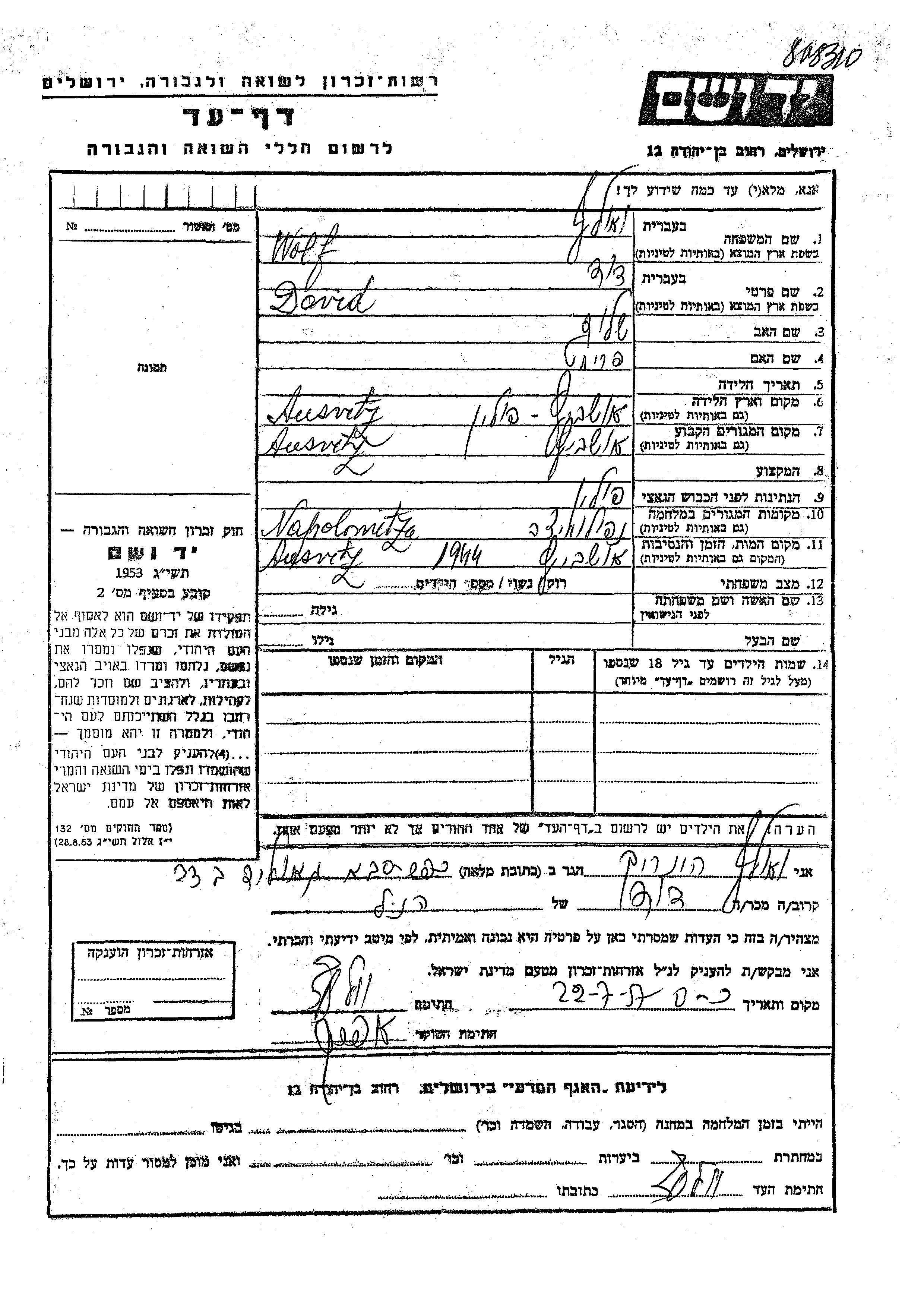 Давид Вольф, место рождения: Аушвиц, Польша. Отец: Шалом, mать:Фримет. Женат / замужем. Место жительства до войны: Аушвиц, Польша. Место во время войны: Наполомица, Польша.