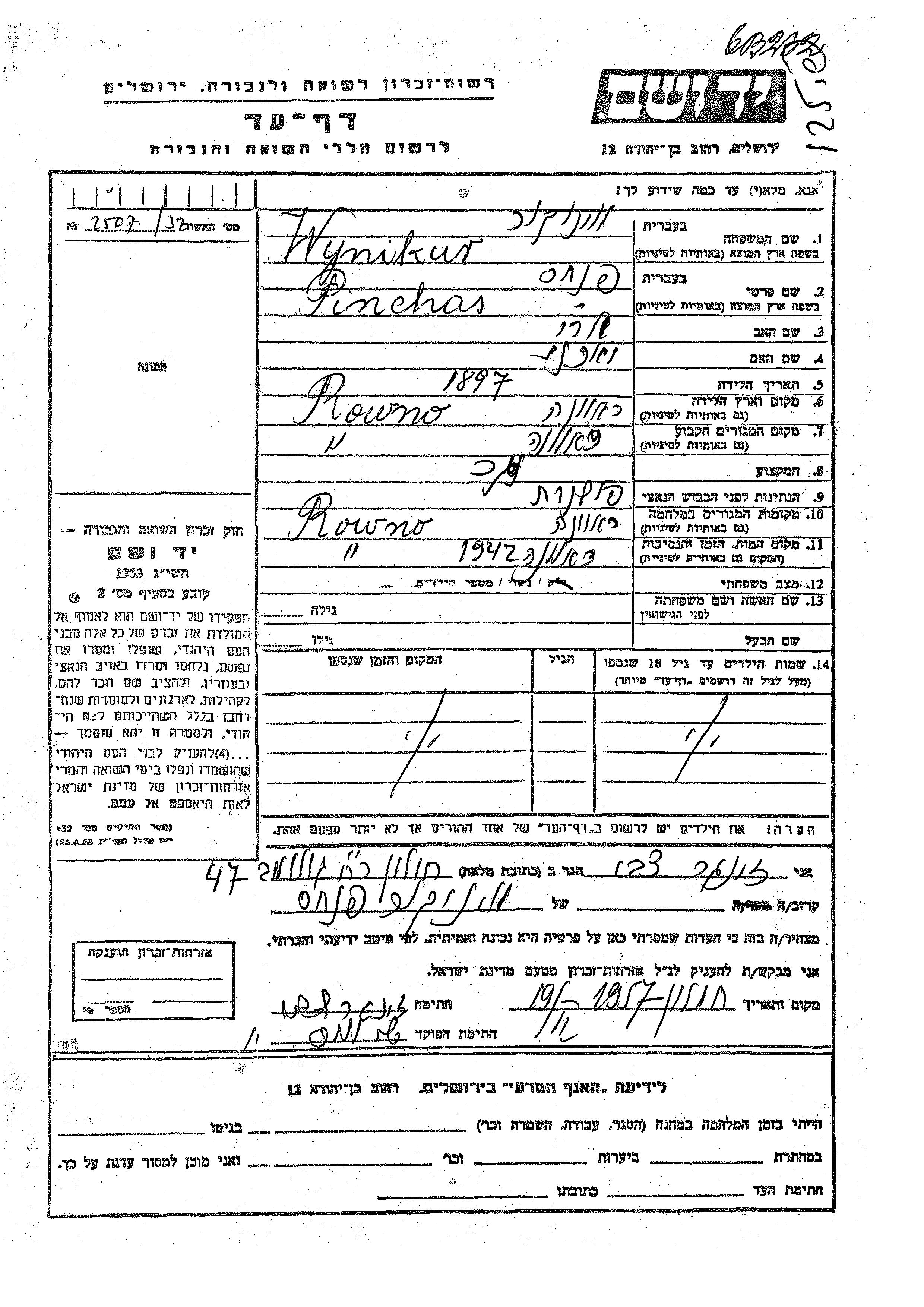 Выникур Винокур Пинхас 1897 Ровно, Польша Лист свидетельских показаний