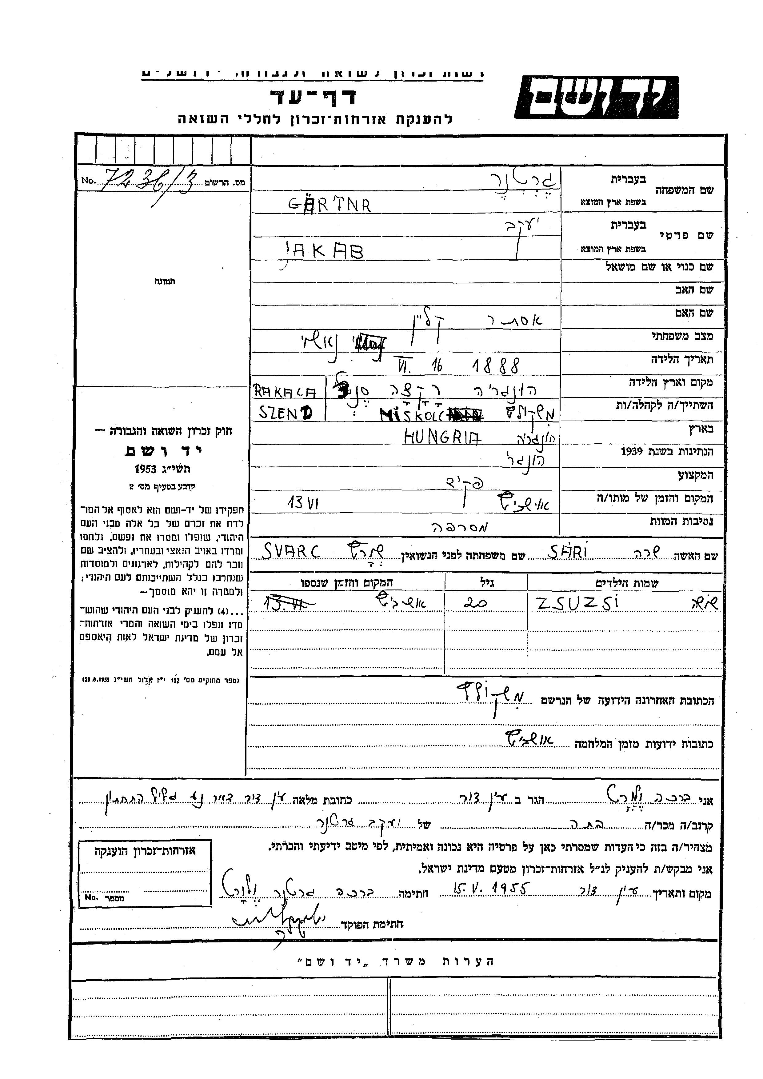 Жужи Гартнер Якаб Сара девичья фамилия Шварц. Место жительства до войны: Сенд, Венгрия. Место во время войны: Аушвиц, Польша.