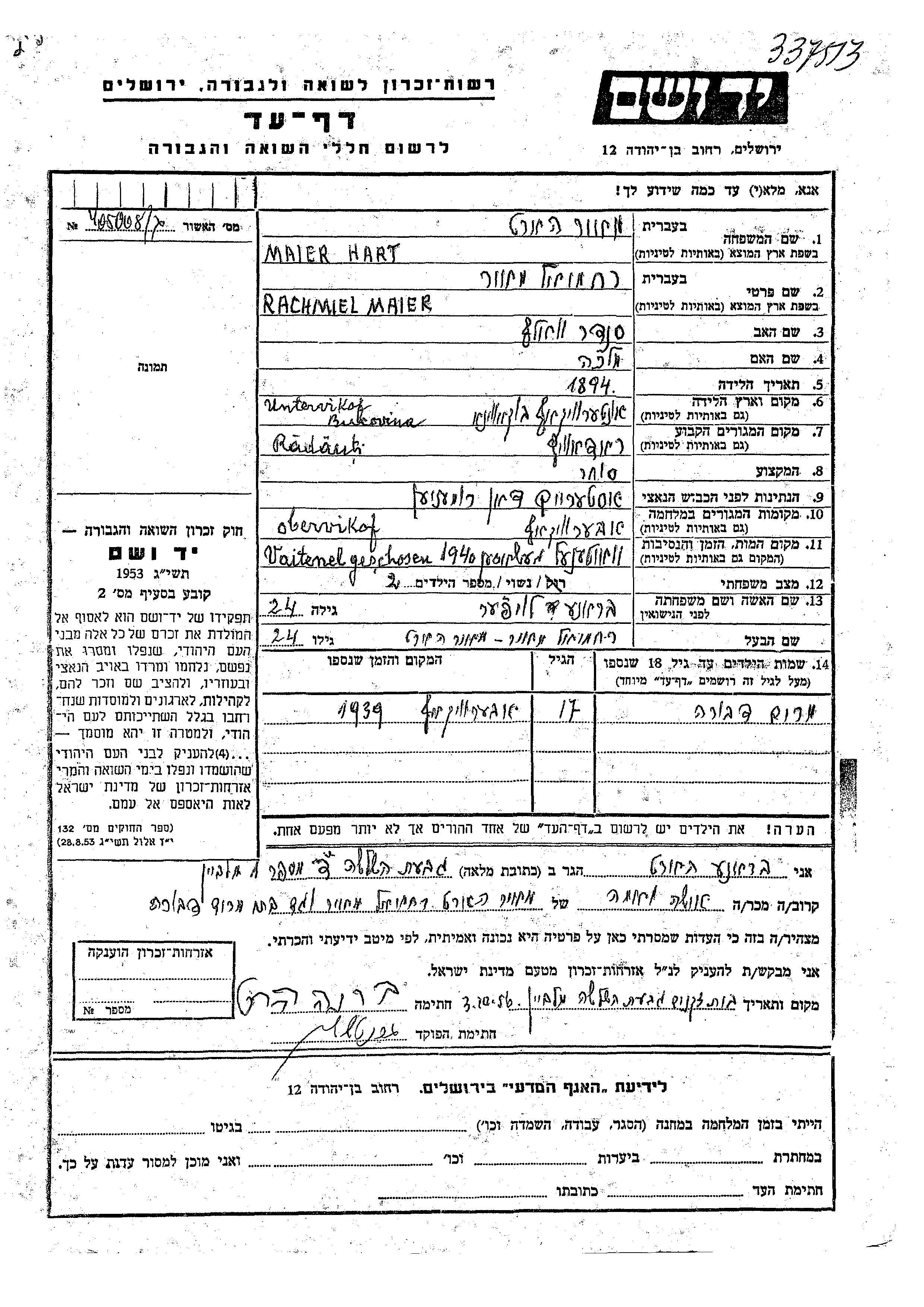 Мирьям Двора Маер Харт Иерахмиэль Маиер Бранэ девичья фамилия Лауфер. Ребенок. Место жительства до войны: Рэдэуци, Румыния. Место во время войны: Обер Виков, Румыния.