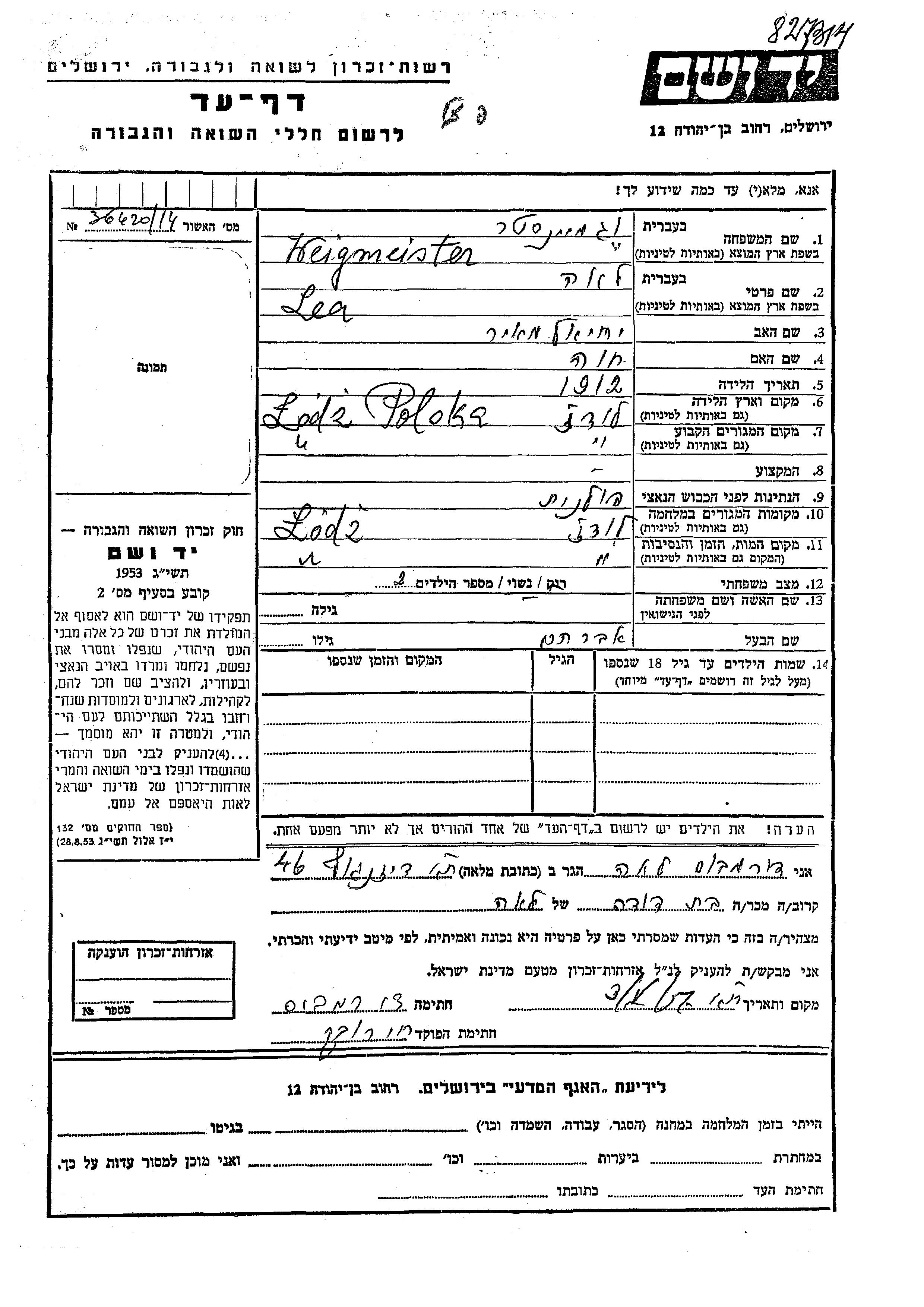 Лея Вейгмейстер, место рождения: Лодзь, Польша. Отец: Иехиэль Меир, mать:Хава. Женат / замужем. Место жительства до войны: Лодзь, Польша. Место во время войны: Лодзь, Польша.