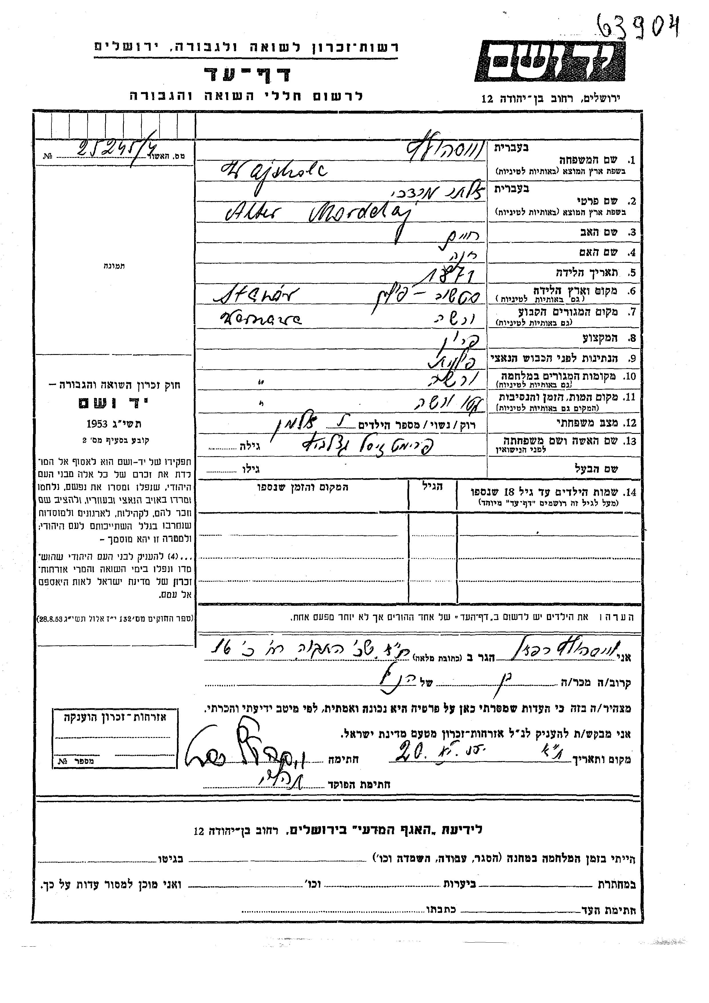 Вайсхольц Мордехай Алтер 1871 Варшава, Польша Лист свидетельских показаний