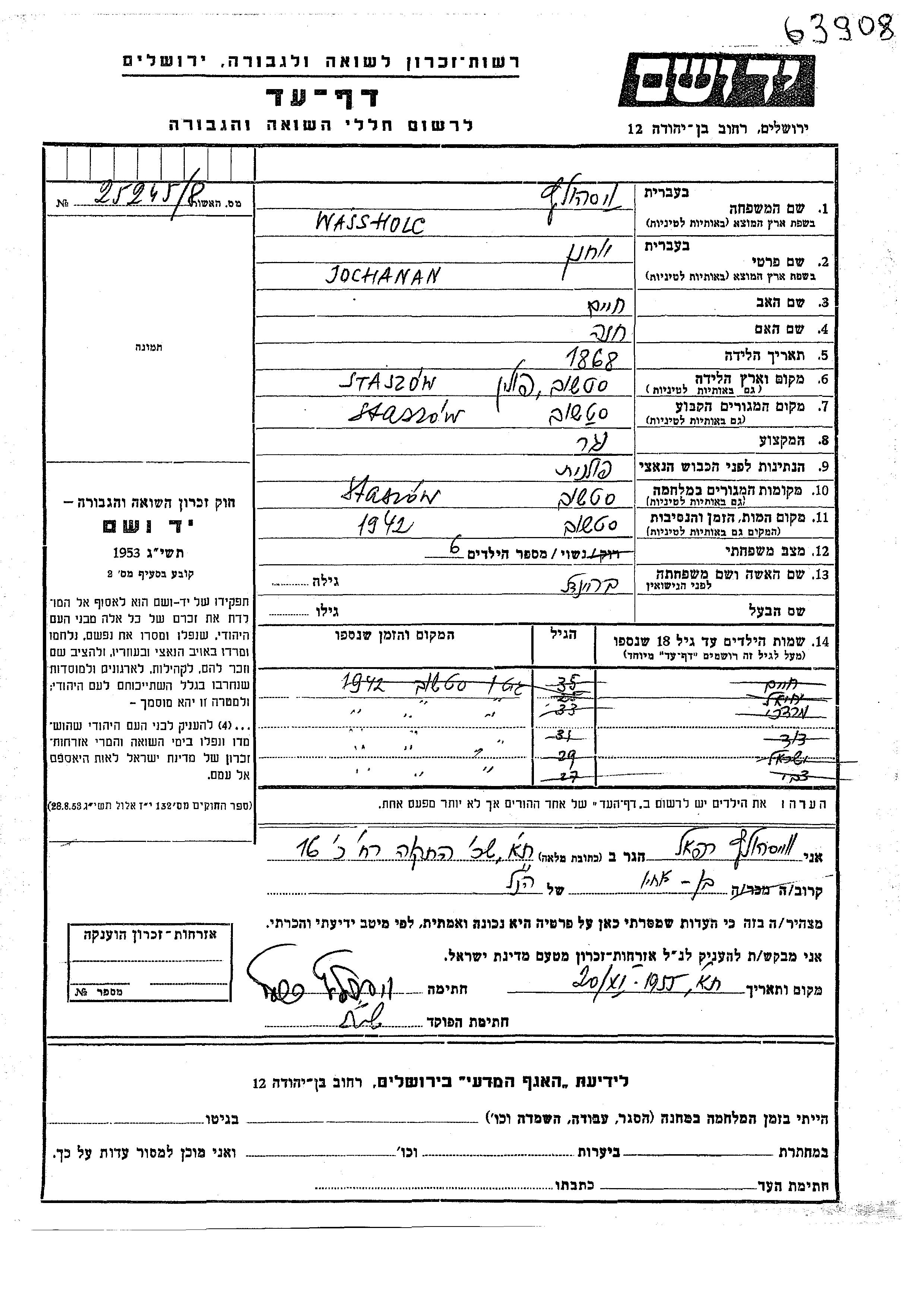 Йоханан Вассхольц, место рождения: Сташув, Польша. Отец: Хаим, mать:Хана. Столяр / плотник. Женат / замужем. Место жительства до войны: Сташув, Польша. Место во время войны: Сташув, Польша.