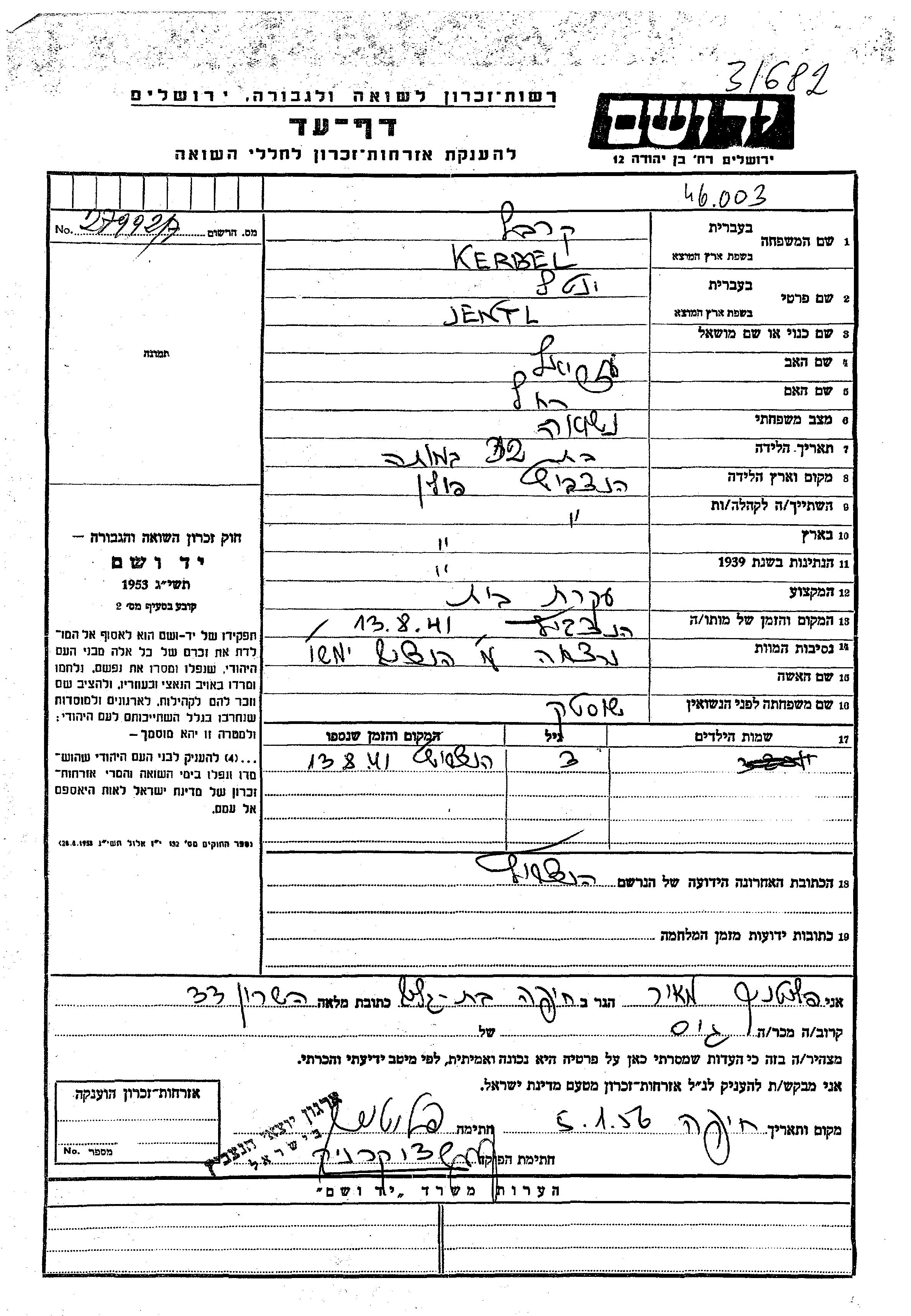 Яд Вашем - Листы свидетельских показаний Мемориального фонда