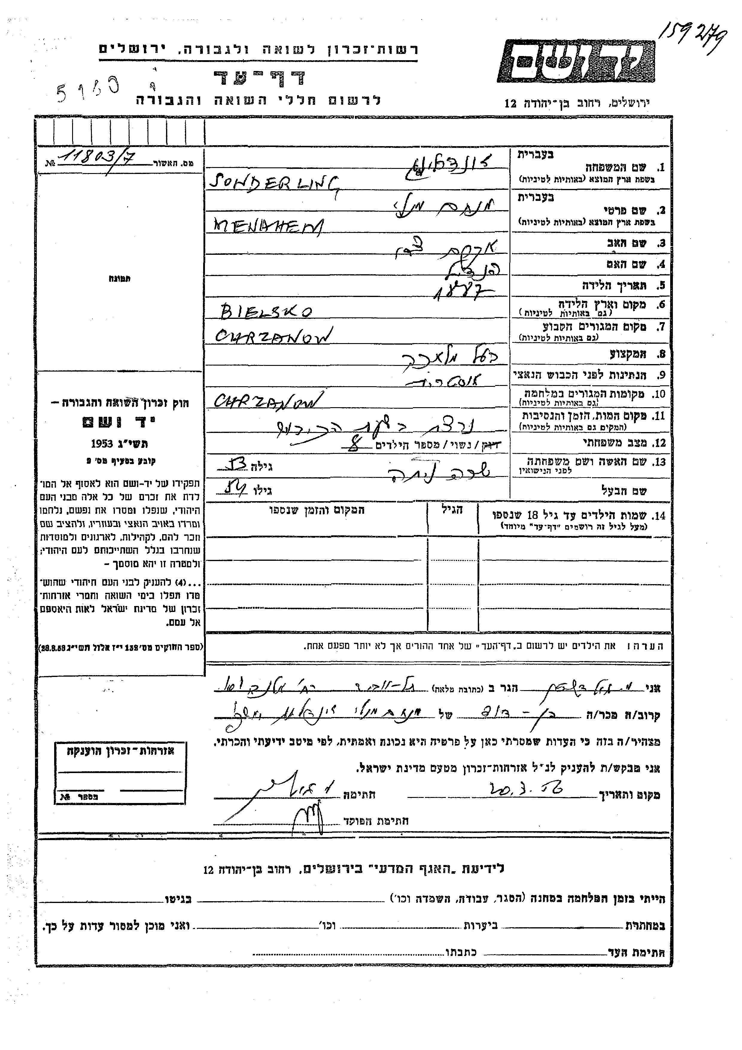 Менахем Мано Сондерлинг Зондерлинг, место рождения: Бельско, Польша. Отец: Абрам Цви, mать:Хендиль. Ремесленник / кустарь. Женат / замужем. Место жительства до войны: Хшанув, Польша. Место во время войны: Хшанув, Польша.