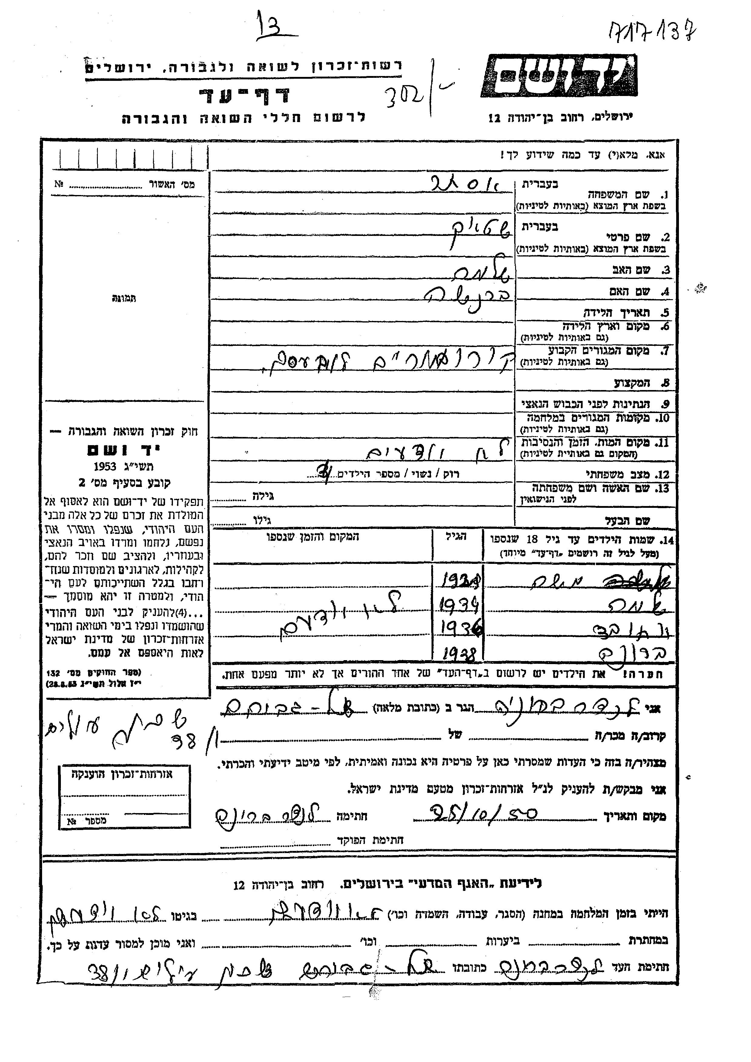Штек Йоховед 1936 место не указано, Лист свидетельских показаний