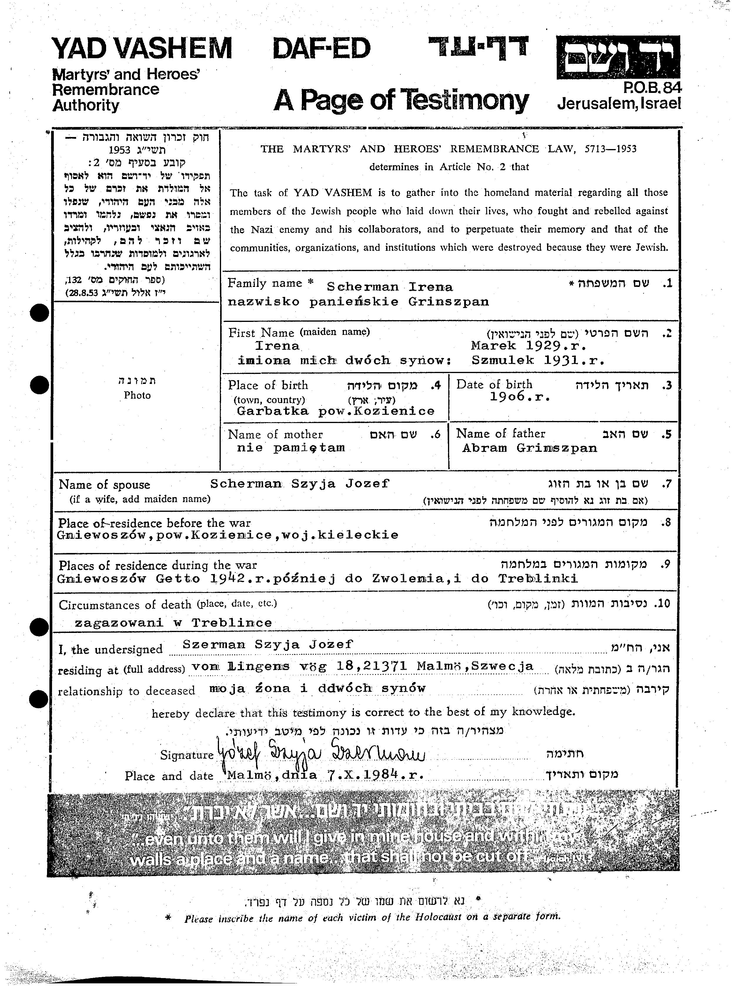 Шерман Марек 1929 Гневошув, Польша Лист свидетельских показаний