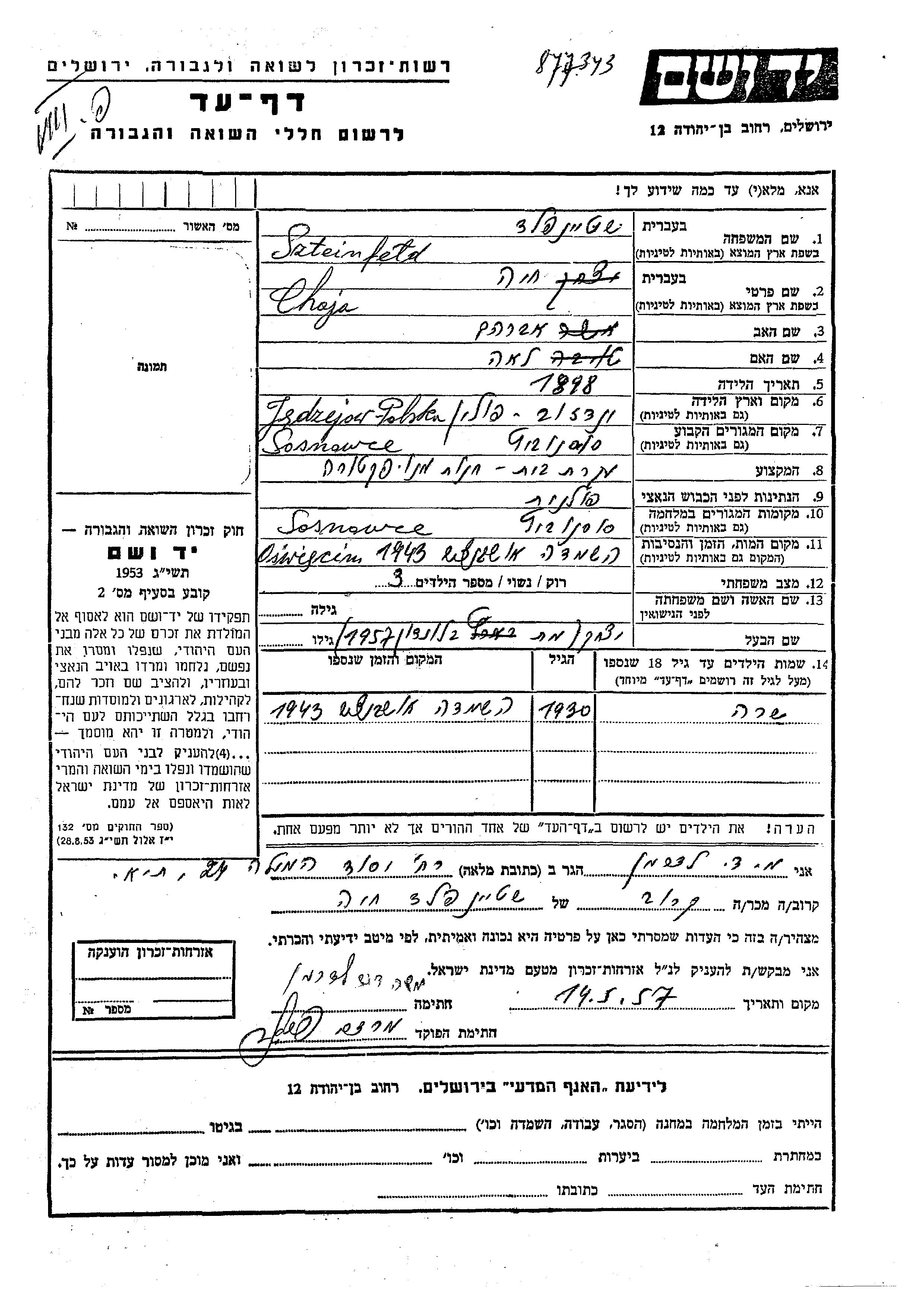 Штейнфельд Сара 1930 Сосновец, Польша Лист свидетельских показаний