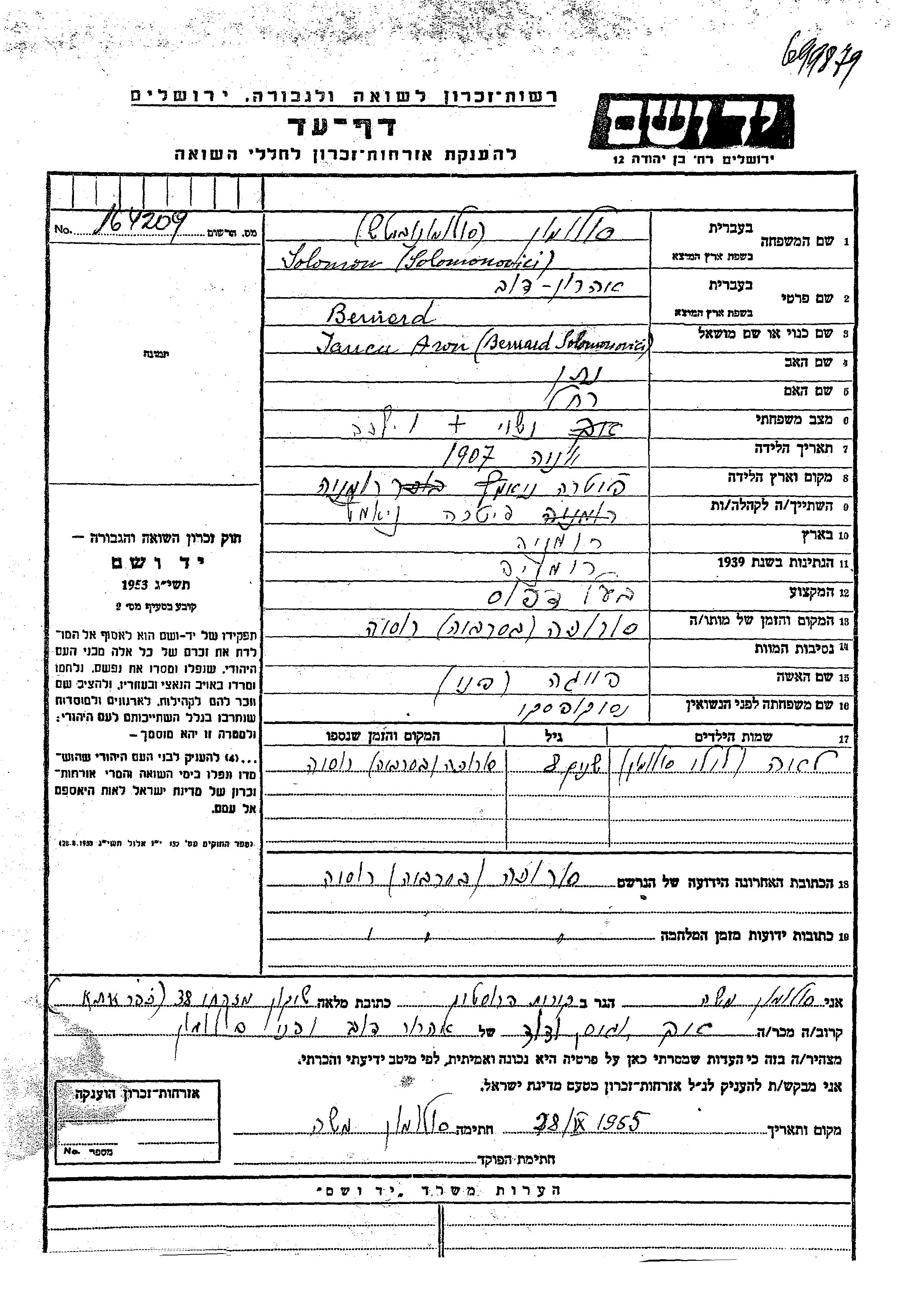 Соломонович Соломон Лея Лили Пятра-Нямц, Румыния Лист свидетельских показаний