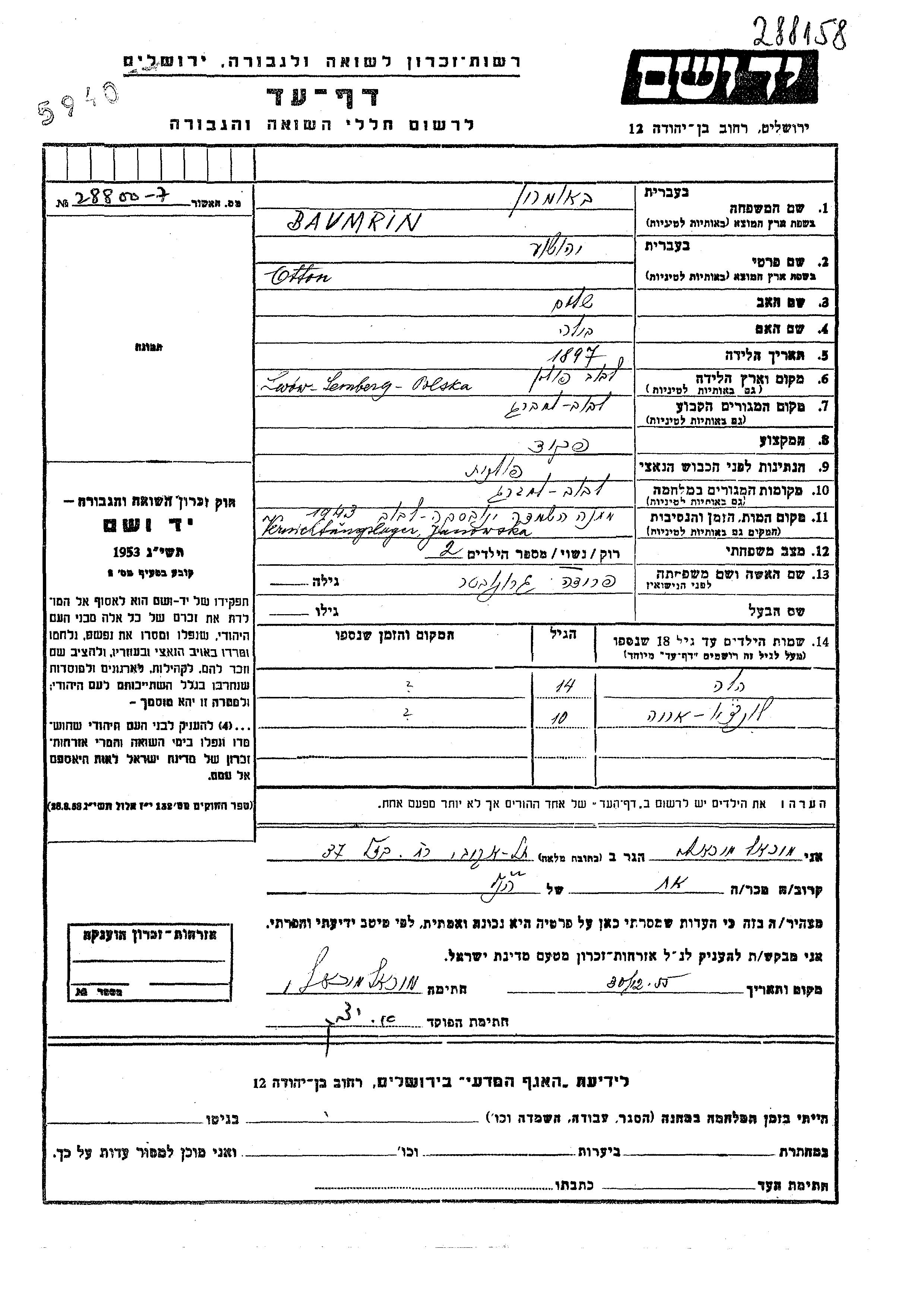 Баумрин Хела Львов, Польша Лист свидетельских показаний