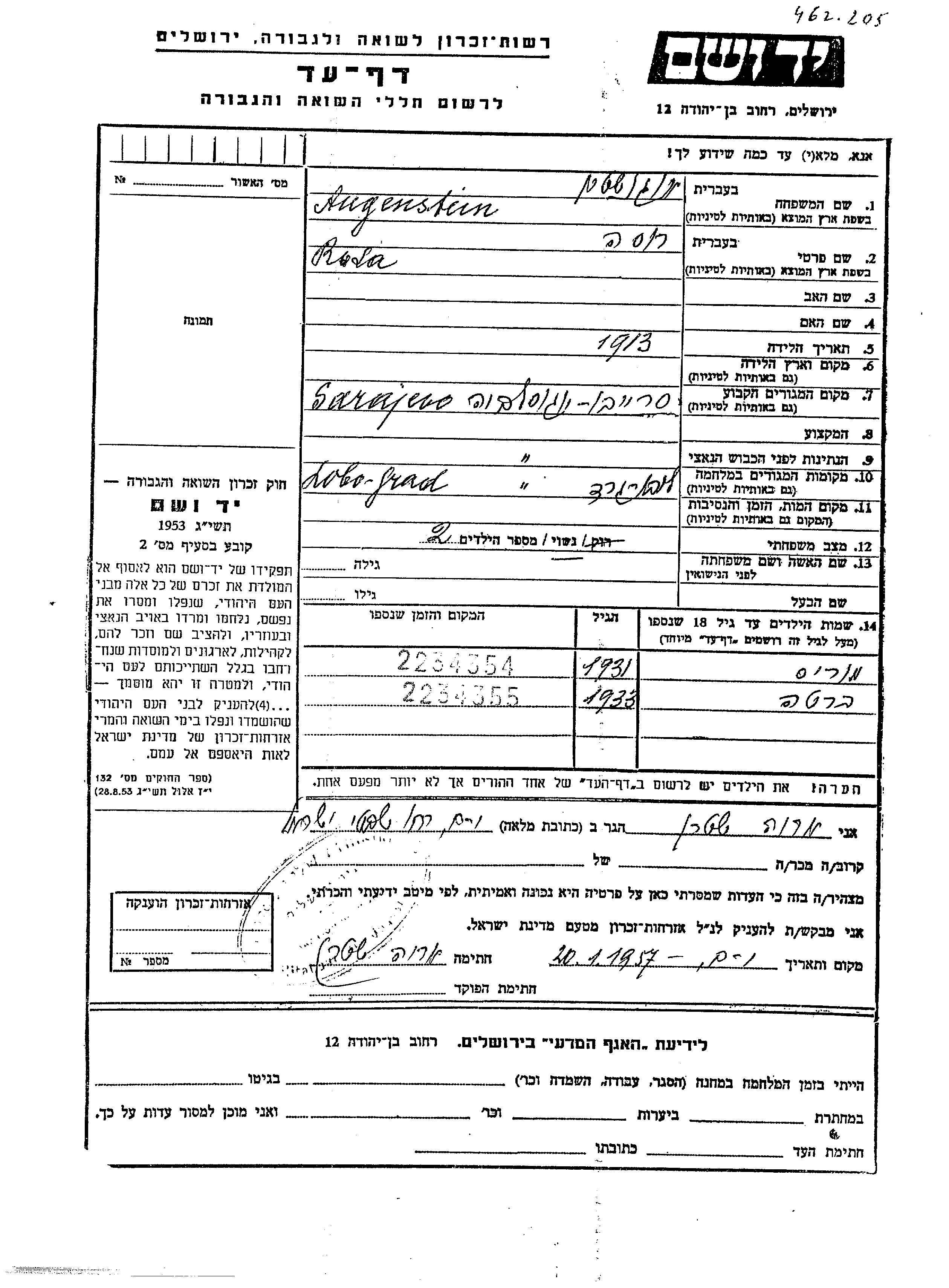 Морис Аугенштайн. Mать:Роза. Ребенок. Место жительства до войны: Сараево, Югославия. Место во время войны: Лоборград, Югославия.