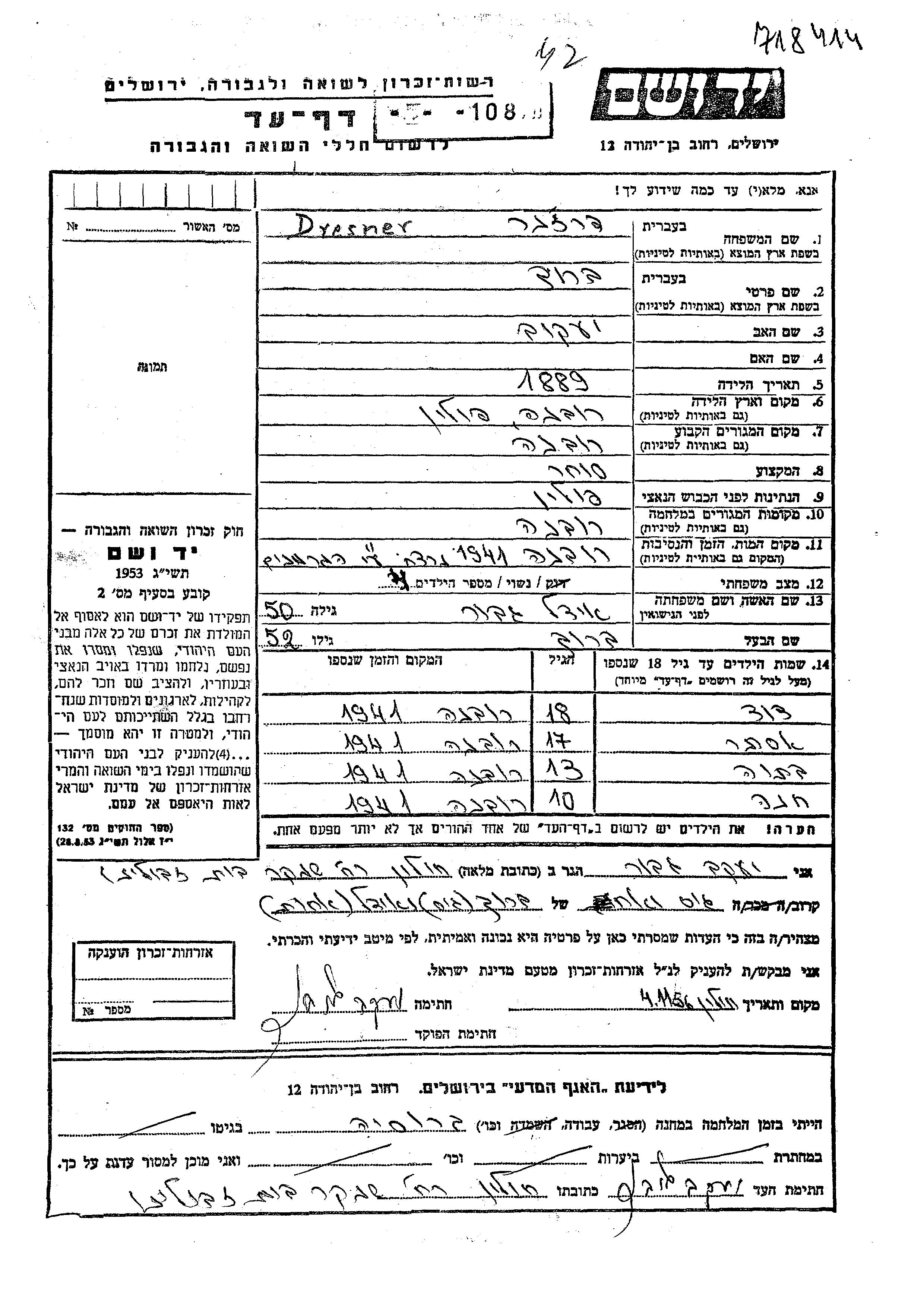 Яд Вашем - Листы свидетельских показаний Мемориального фонда