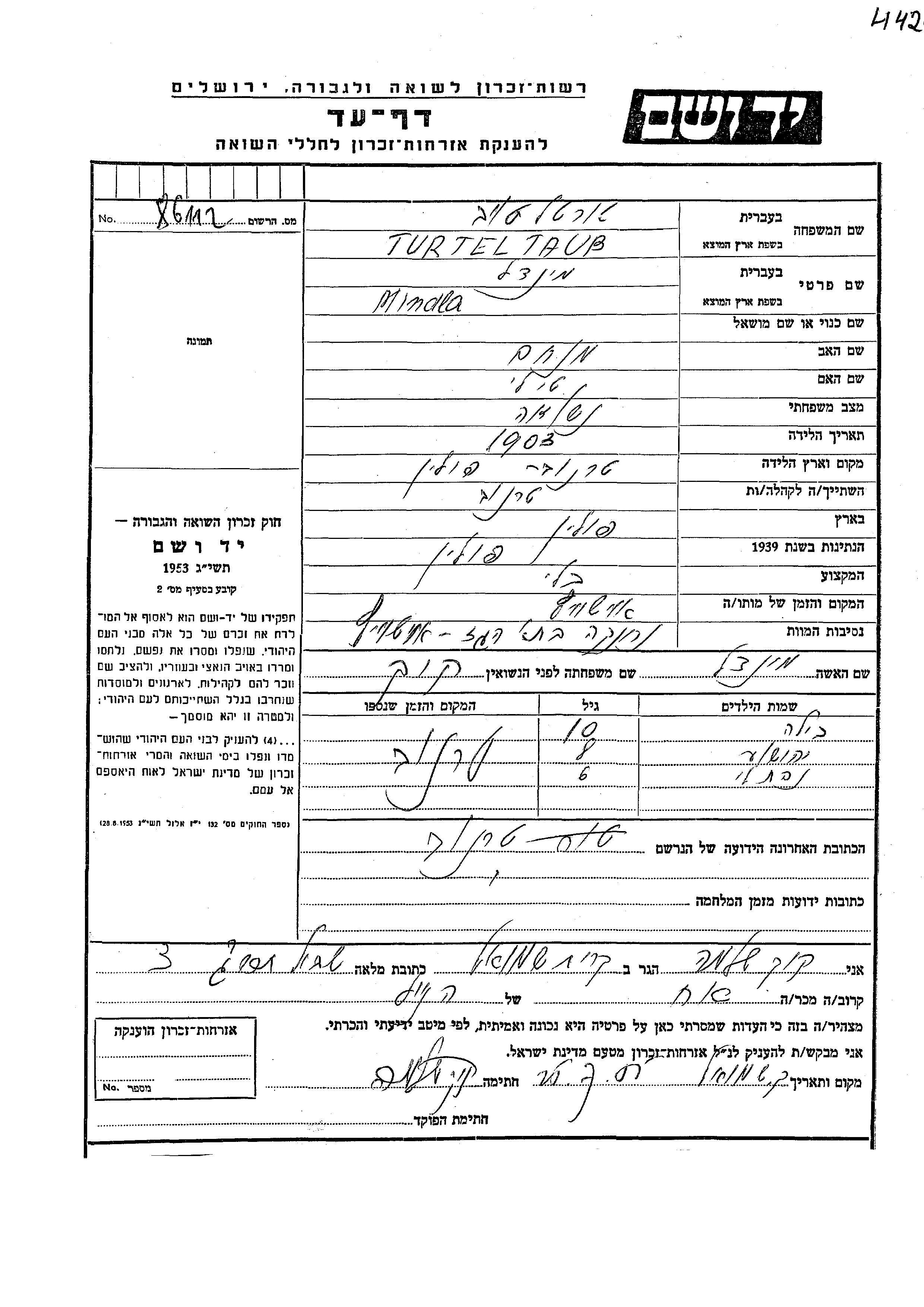 Туртельтауб Била Тарнув, Польша Лист свидетельских показаний