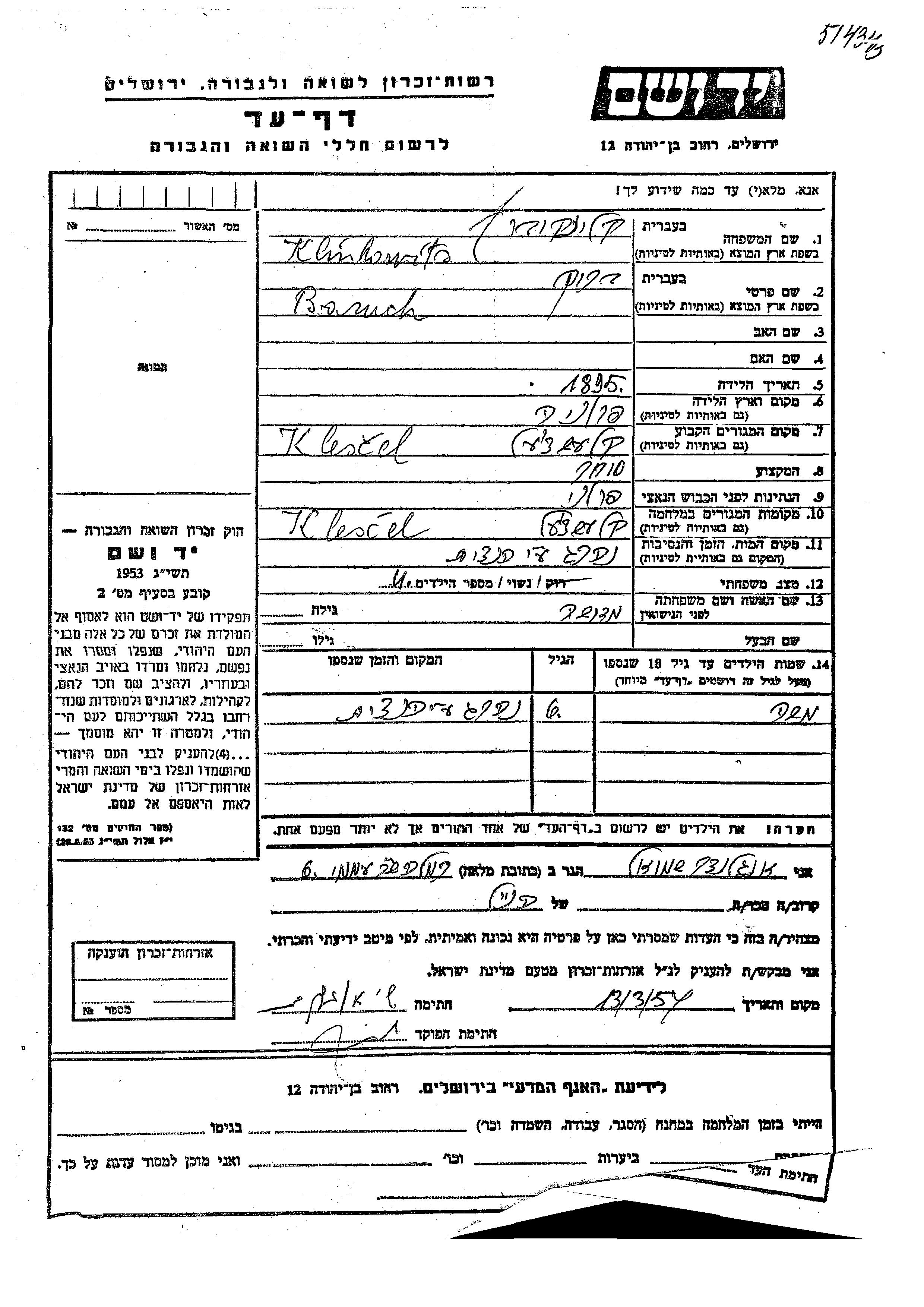 Клинковиц Моше Клещеле, Польша Лист свидетельских показаний