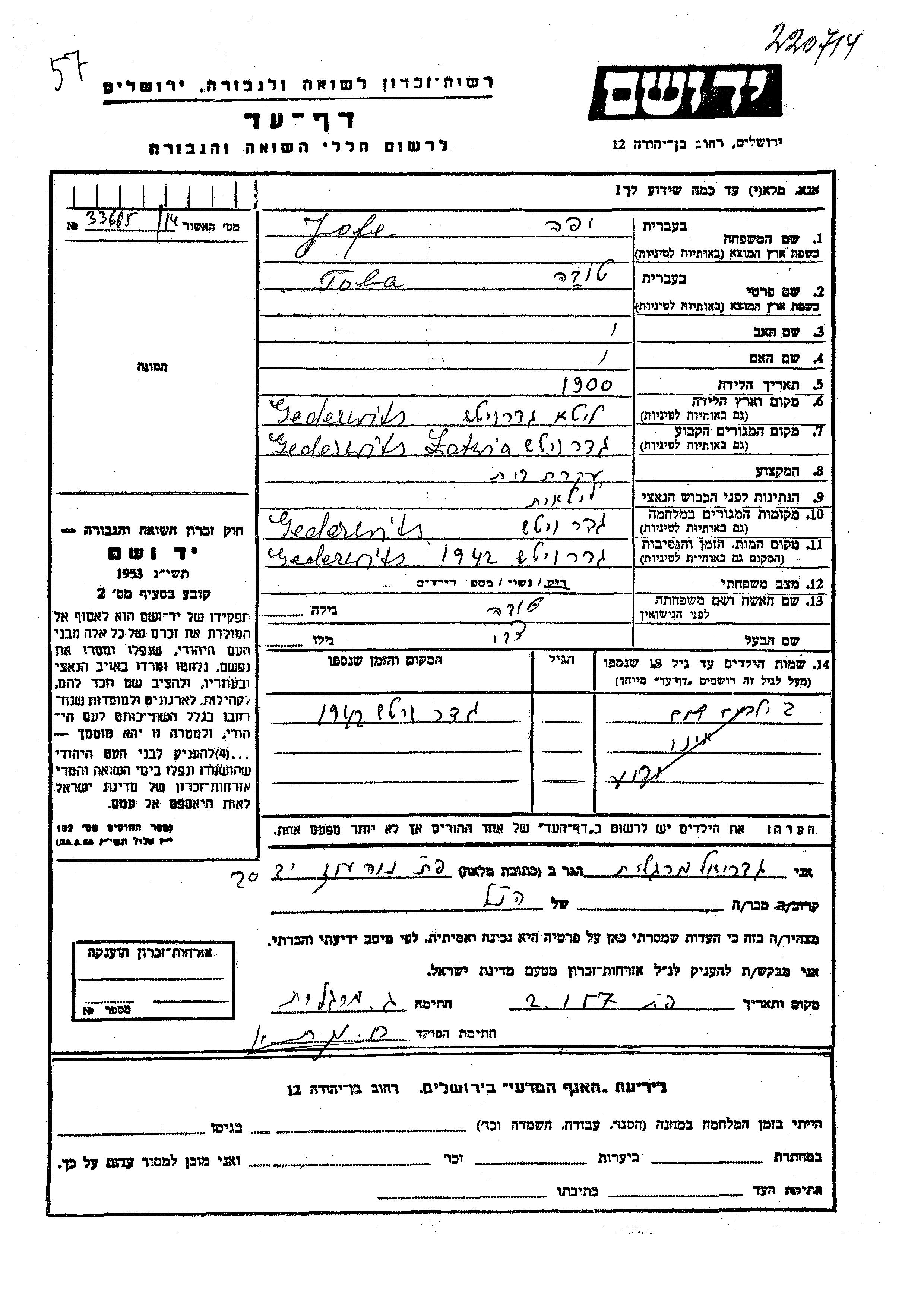 Тоба Това Йофе, место рождения: Гиедрайчай, Литва. Домохозяйка. Женат / замужем. Место жительства до войны: Гиедрайчай, Литва. Место во время войны: Гиедрайчай, Литва.