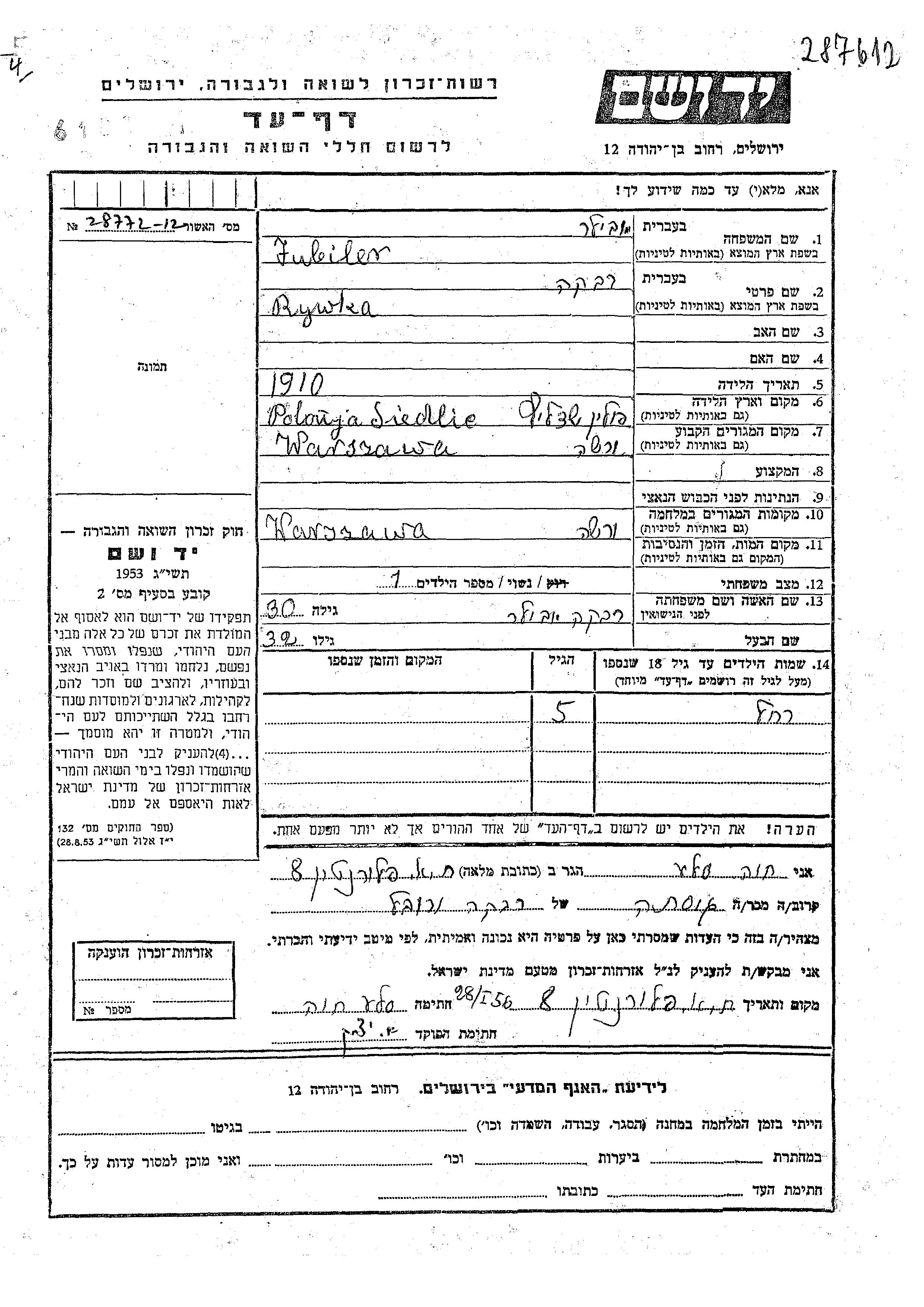 Рывка Юбилер, место рождения: Седльце, Польша. Женат / замужем. Место жительства до войны: Варшава, Польша. Место во время войны: Варшава, Польша.