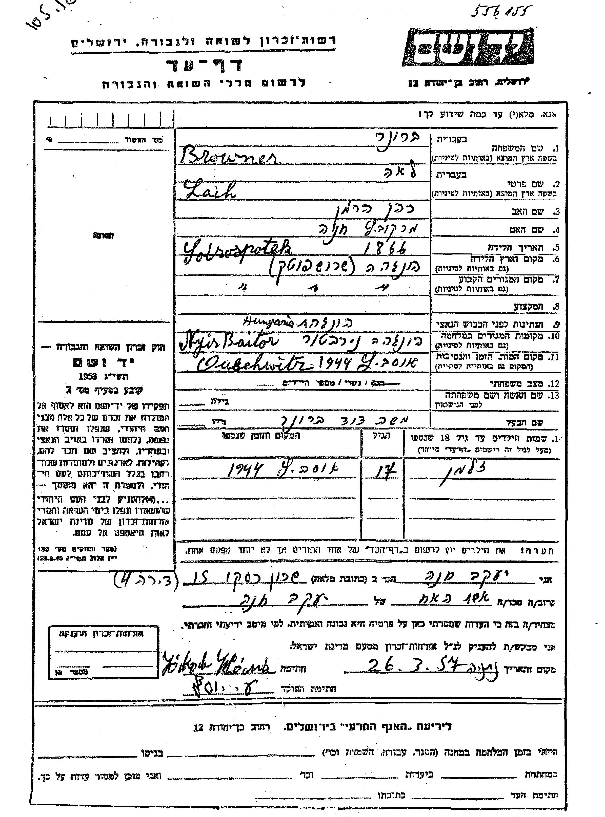Залман Броунер Моше Давид Лаи девичья фамилия Коэн. Ребенок. Место жительства до войны: Шарошпатак, Венгрия. Место во время войны: Ньирбатор, Венгрия.