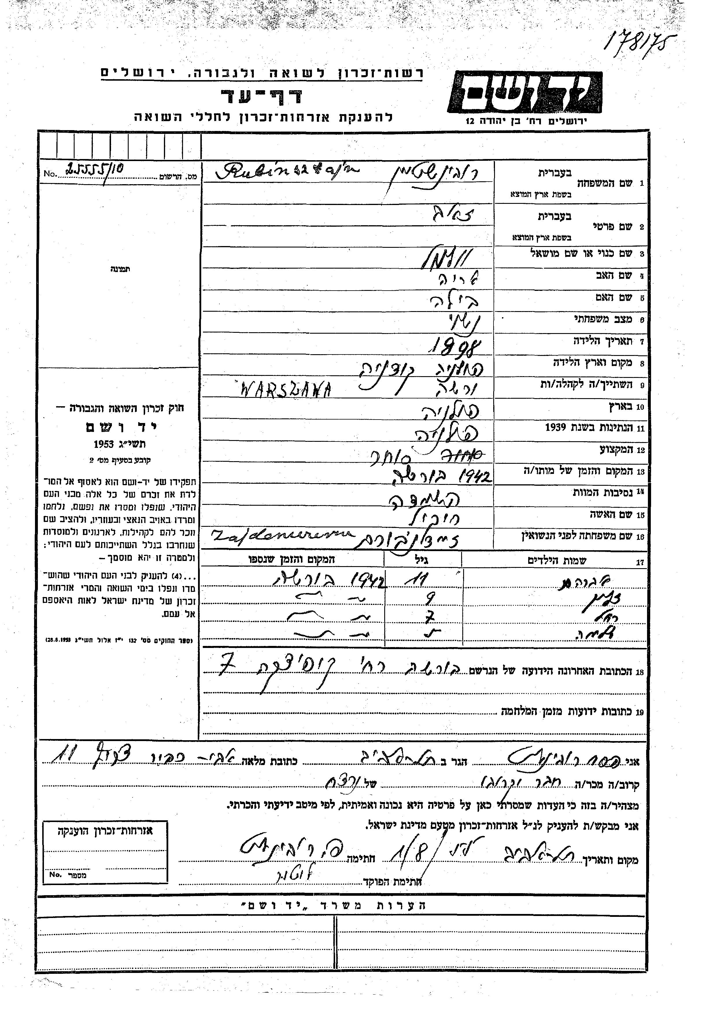 Рубинштайн Рахель Варшава, Польша Лист свидетельских показаний