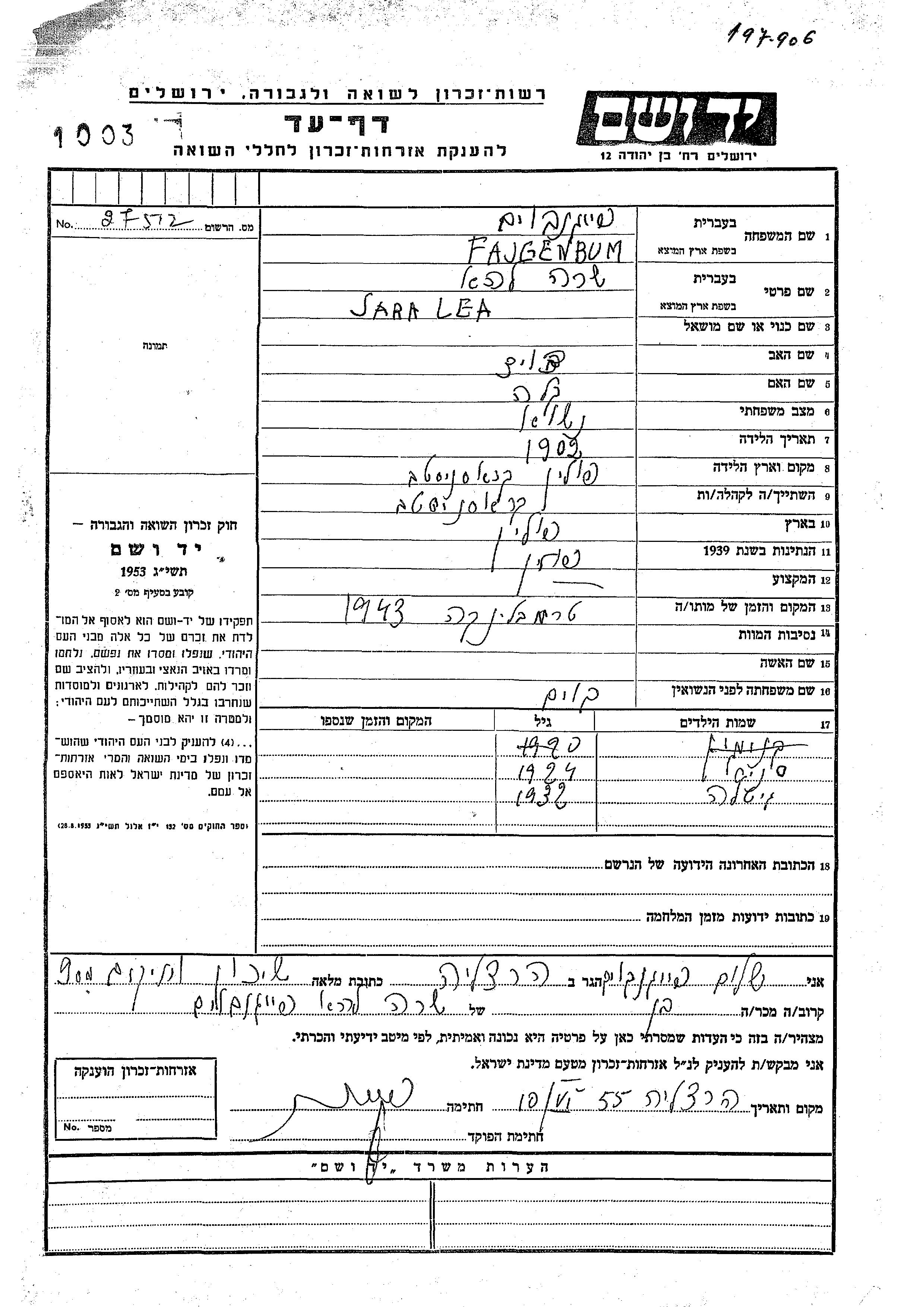Яд Вашем - Листы свидетельских показаний Мемориального фонда