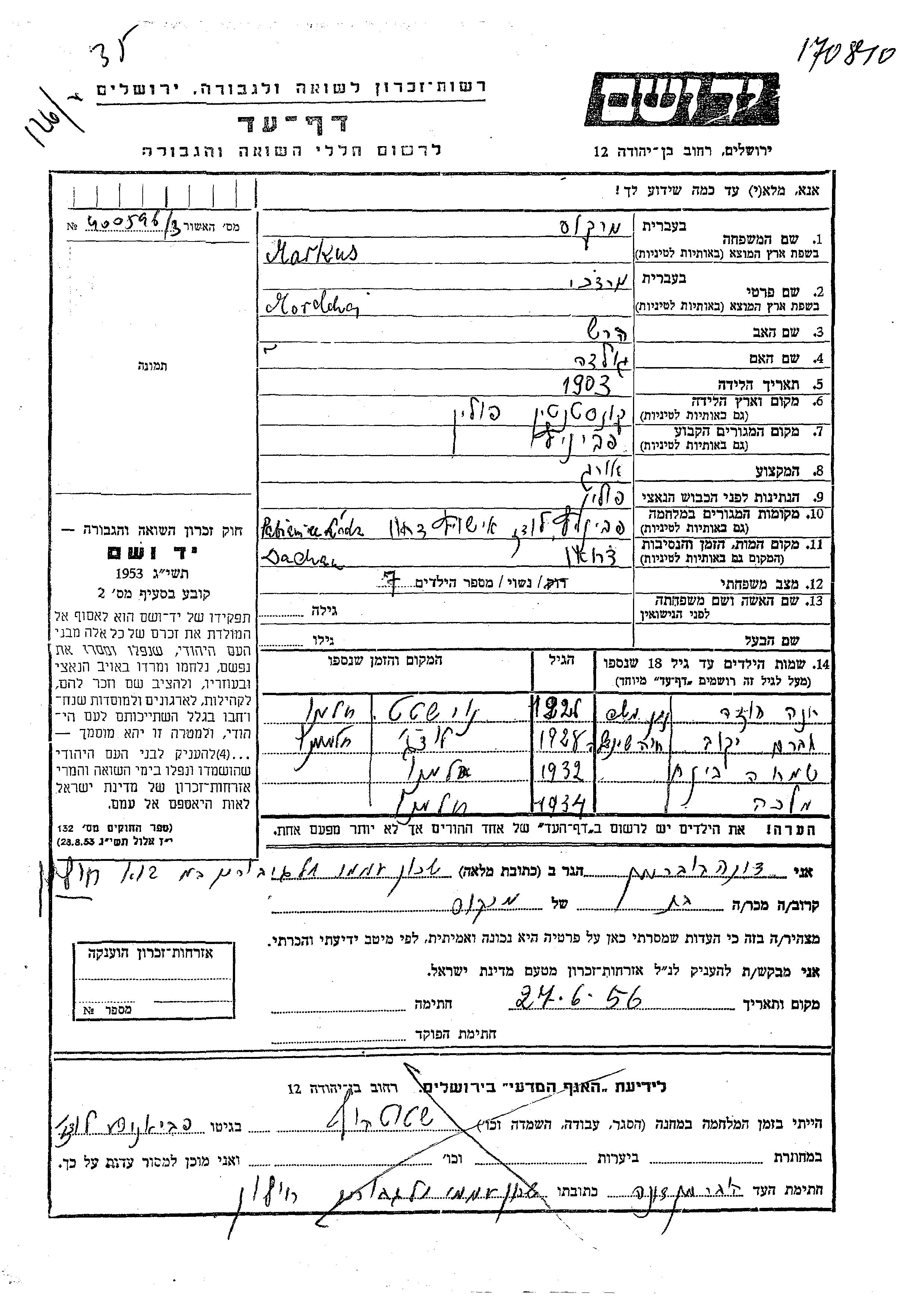 Маркус Хая Шайндла Пабьянице, Польша Лист свидетельских показаний