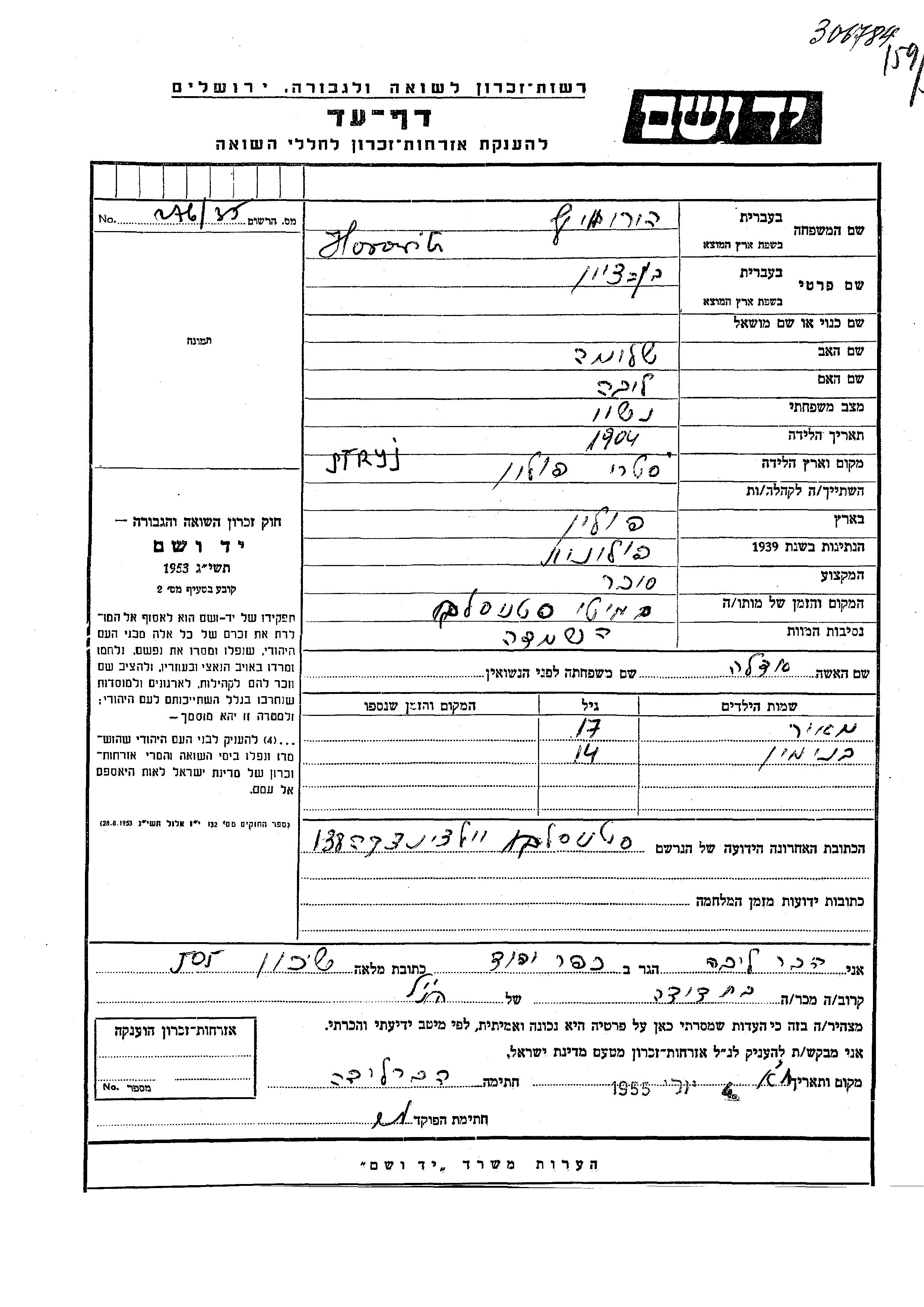 Яд Вашем - Листы свидетельских показаний Мемориального фонда