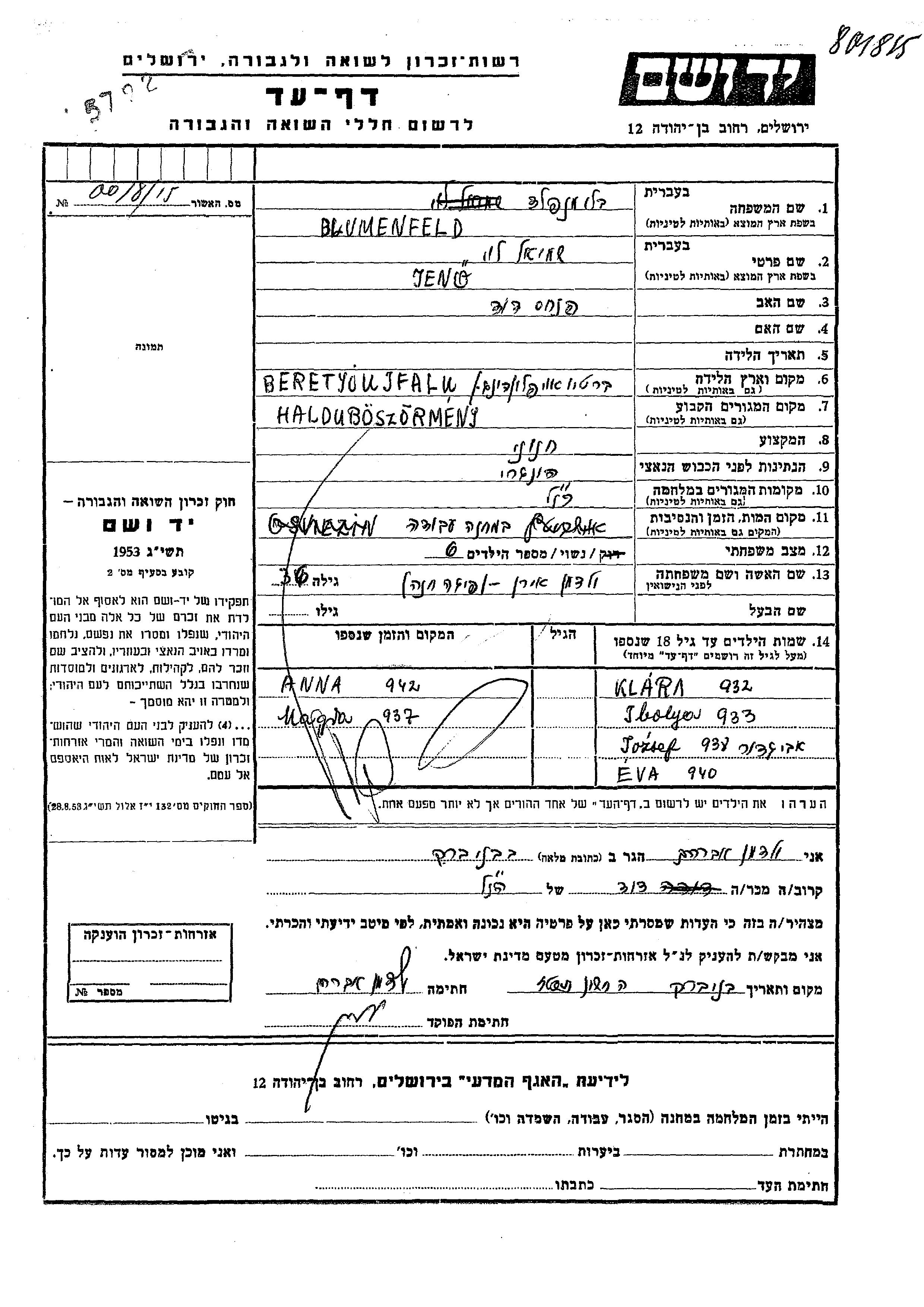 Блюменфельд Эва Хайдубёсёрмень, Венгрия Лист свидетельских показаний