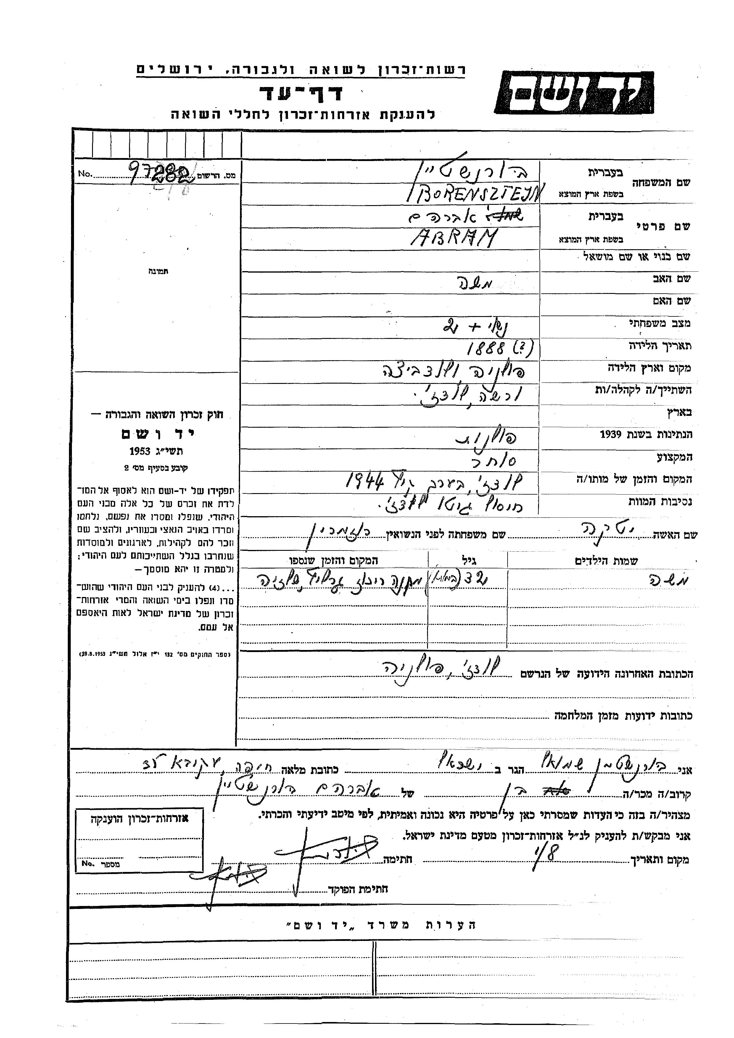 Боренштейн Моше место не указано, Лист свидетельских показаний