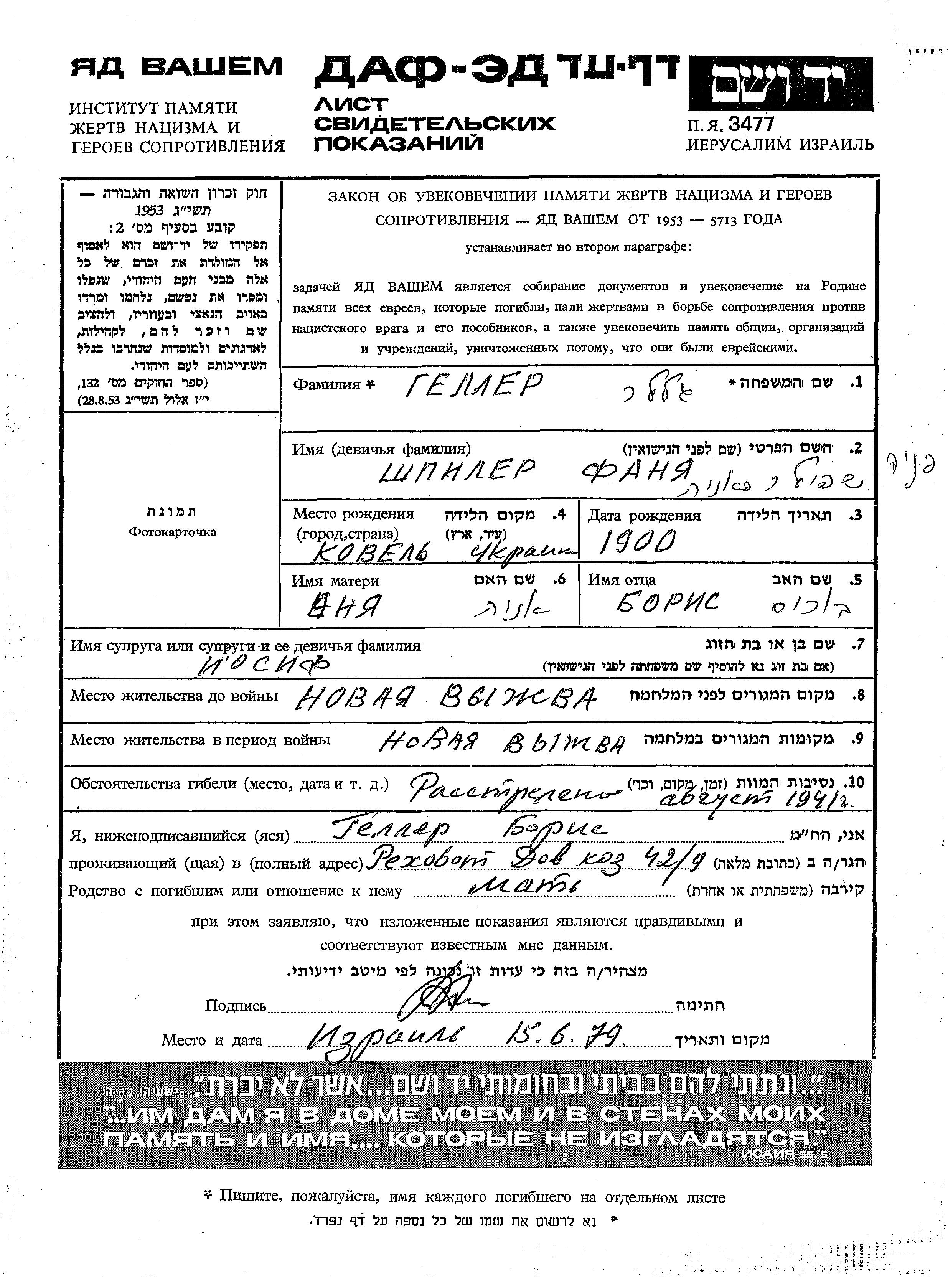 Яд Вашем - Листы свидетельских показаний Мемориального фонда
