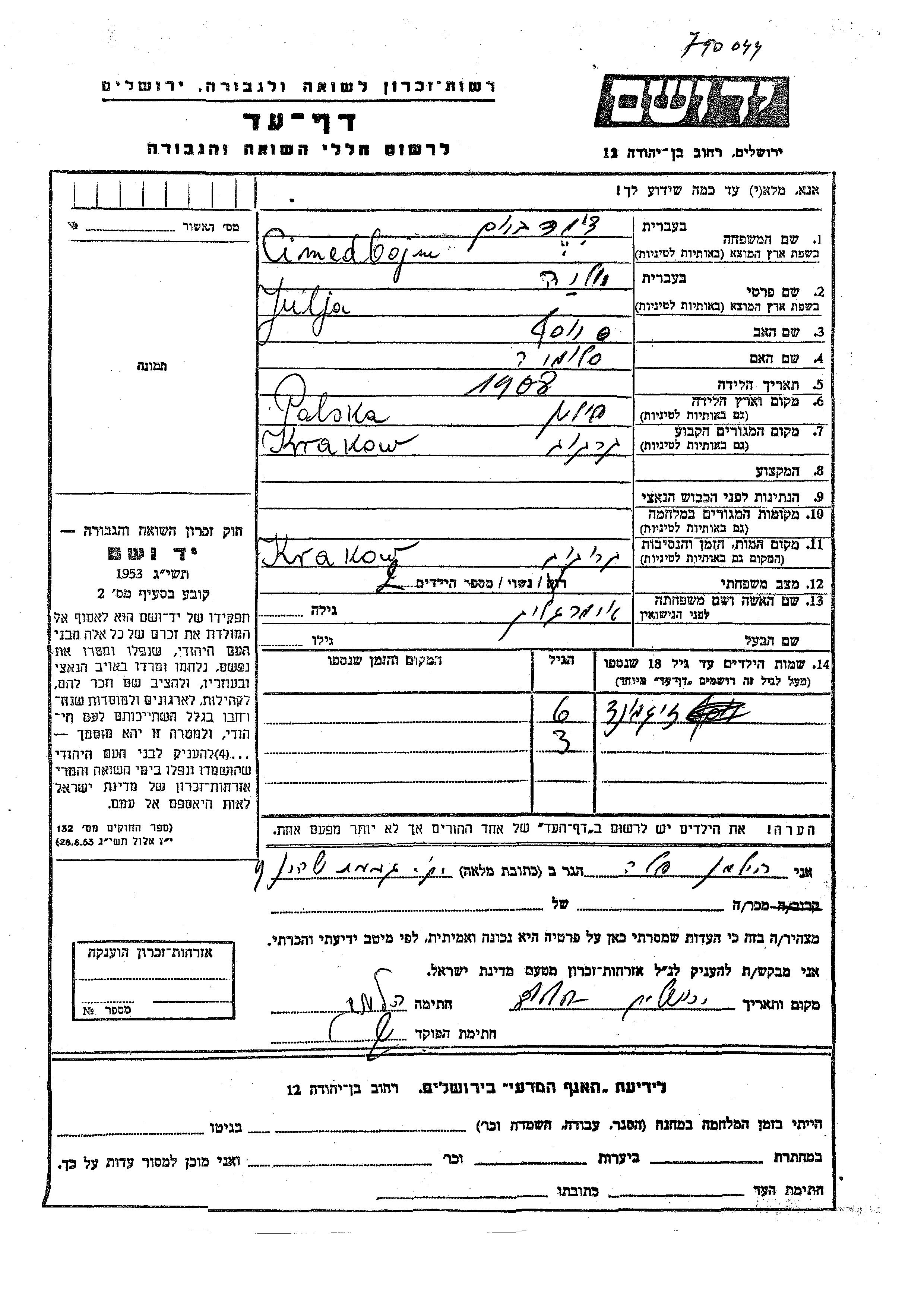 Цимедбойм Имя неизвестно Краков, Польша Лист свидетельских показаний