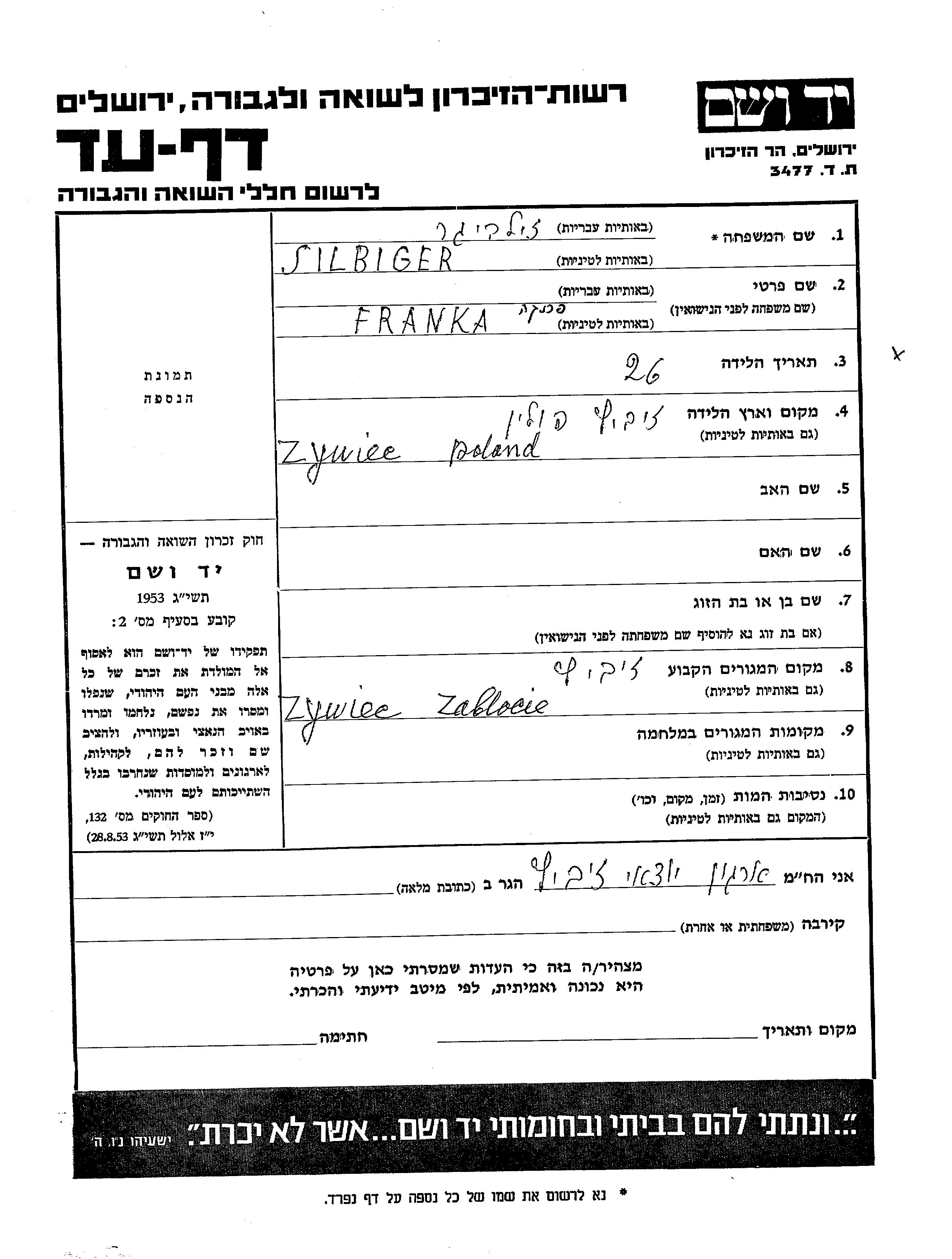 Зильбигер Франка Живец, Польша Лист свидетельских показаний