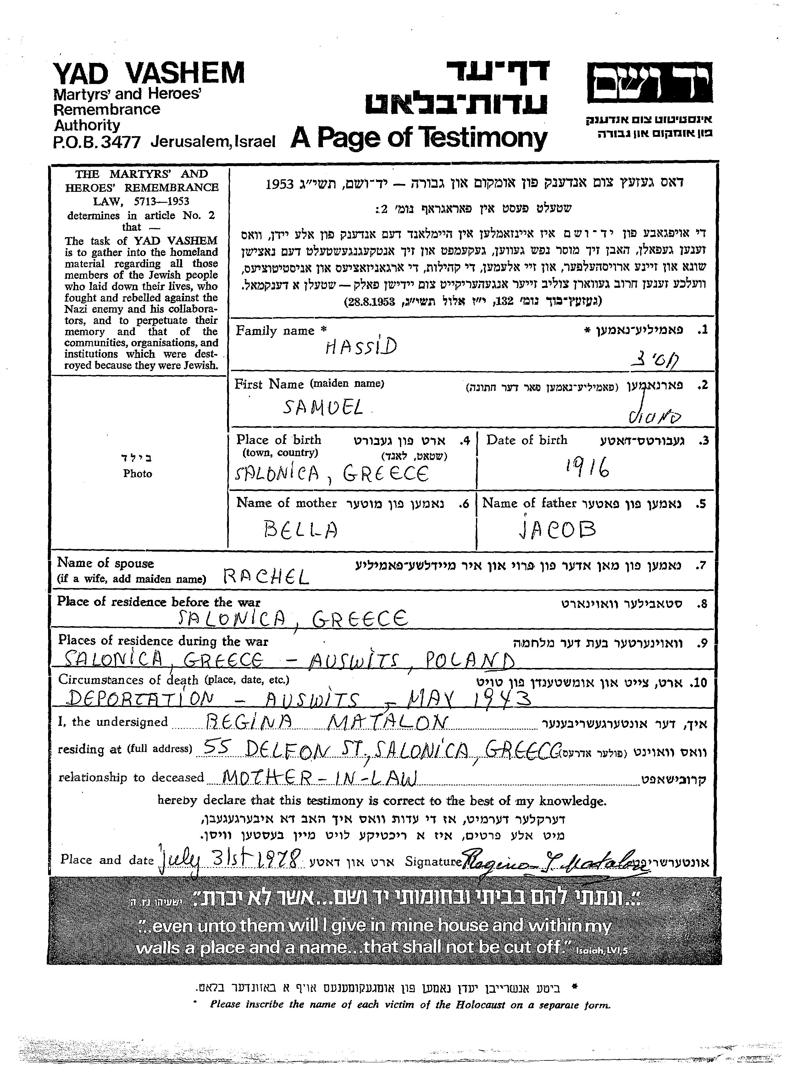 Самуэль Хассид, место рождения: Салоники, Греция. Отец: Якоб, mать:Белла. Женат / замужем. Место жительства до войны: Салоники, Греция. Место во время войны: Салоники, Греция.