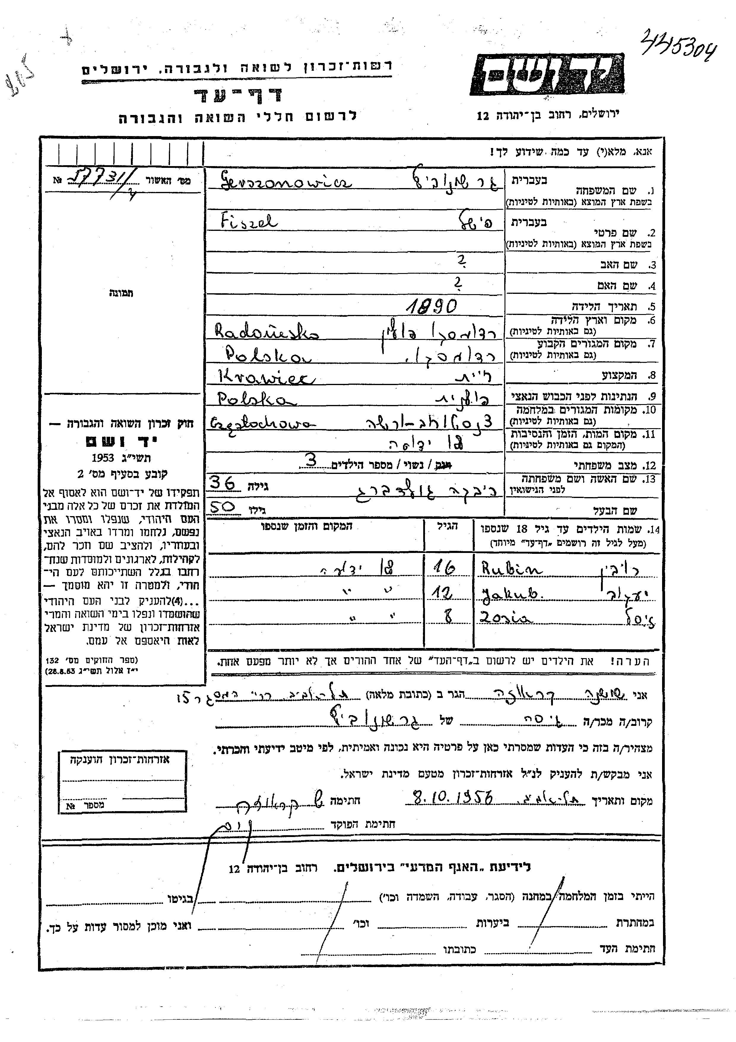 Гершонович Якуб Радомско, Польша Лист свидетельских показаний