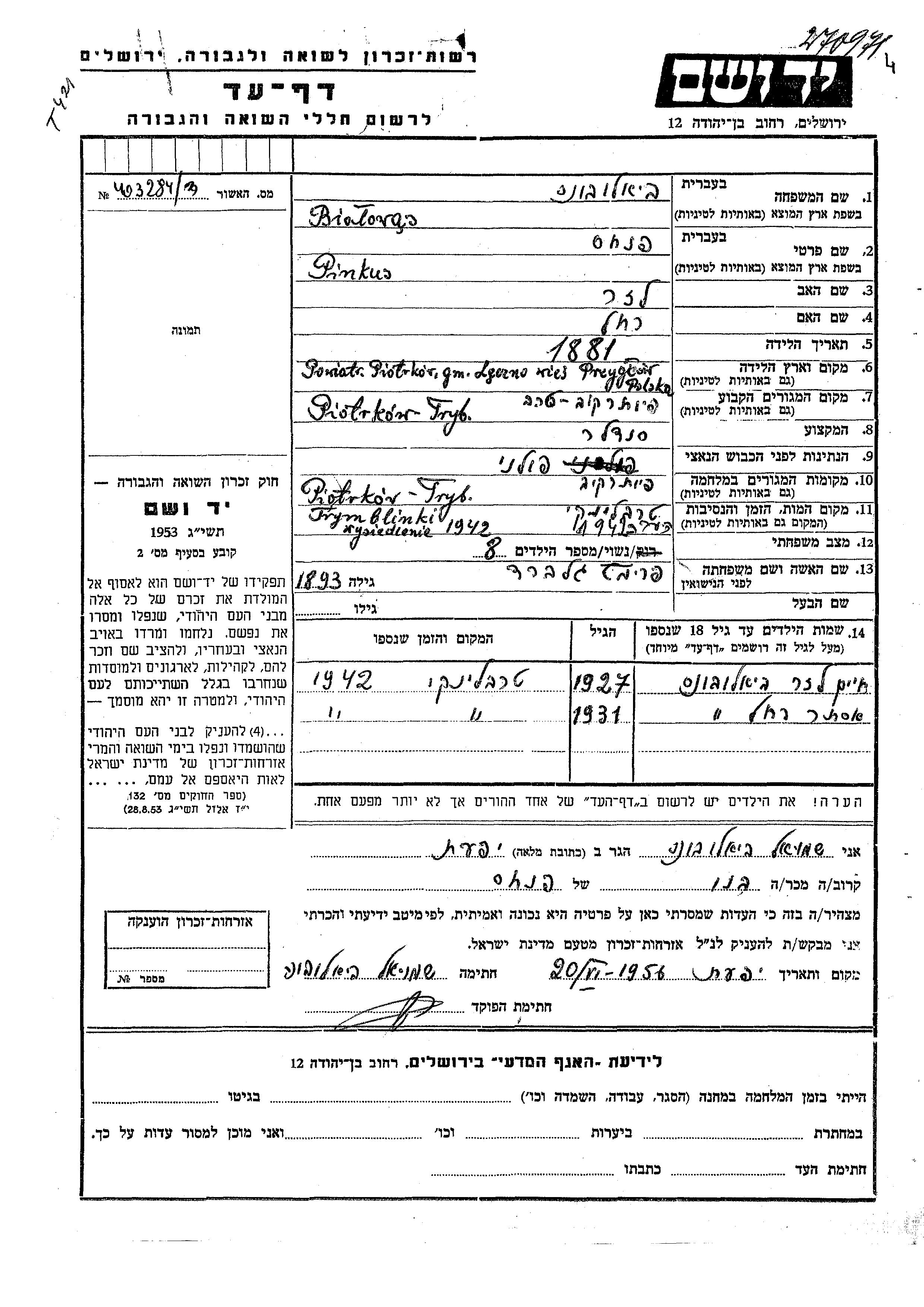 Бяловас Хаим Лазарь 1927 Пётркув, Польша Лист свидетельских показаний