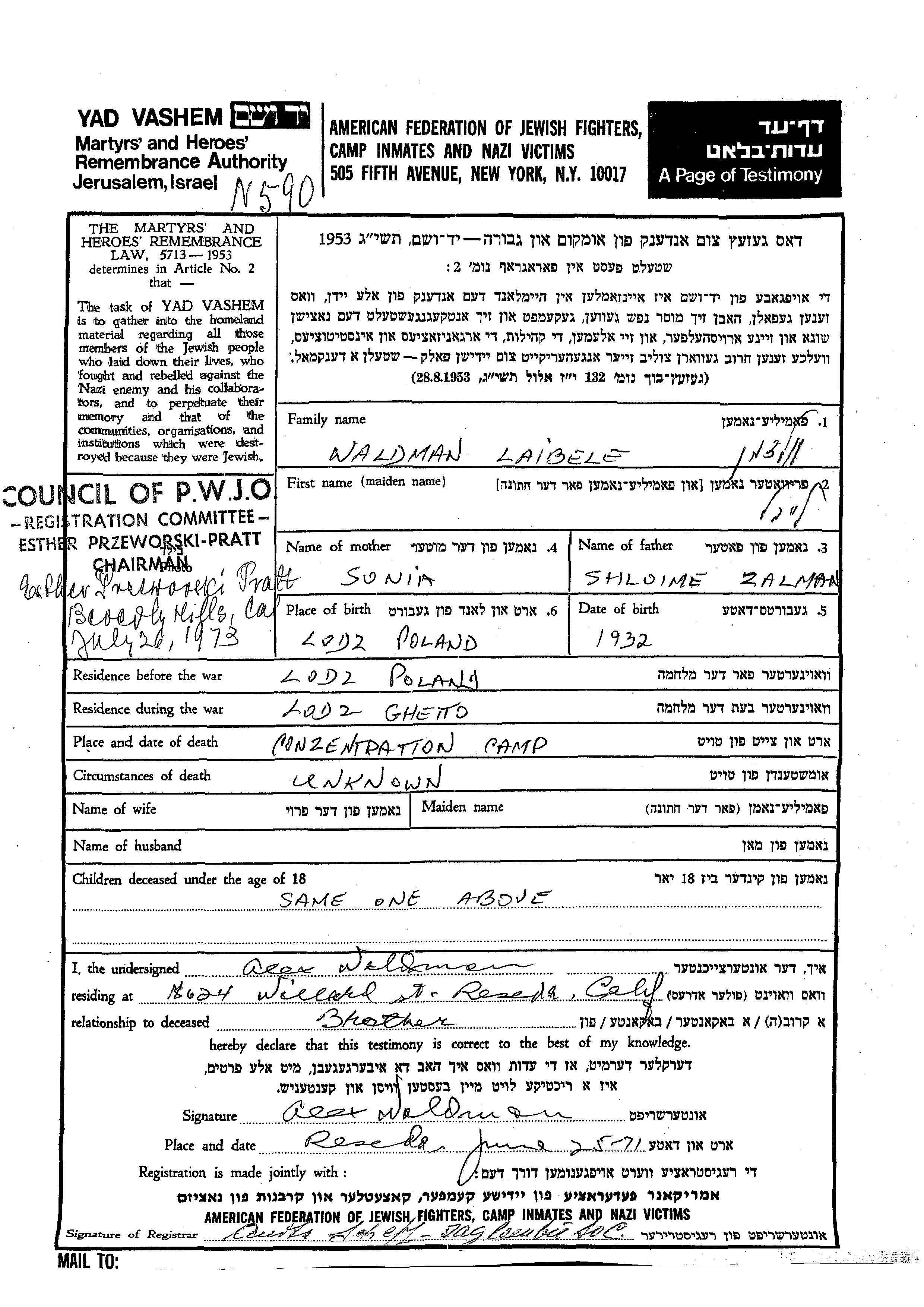 Вальдман Лайбеле 1932 Лодзь, Польша Лист свидетельских показаний