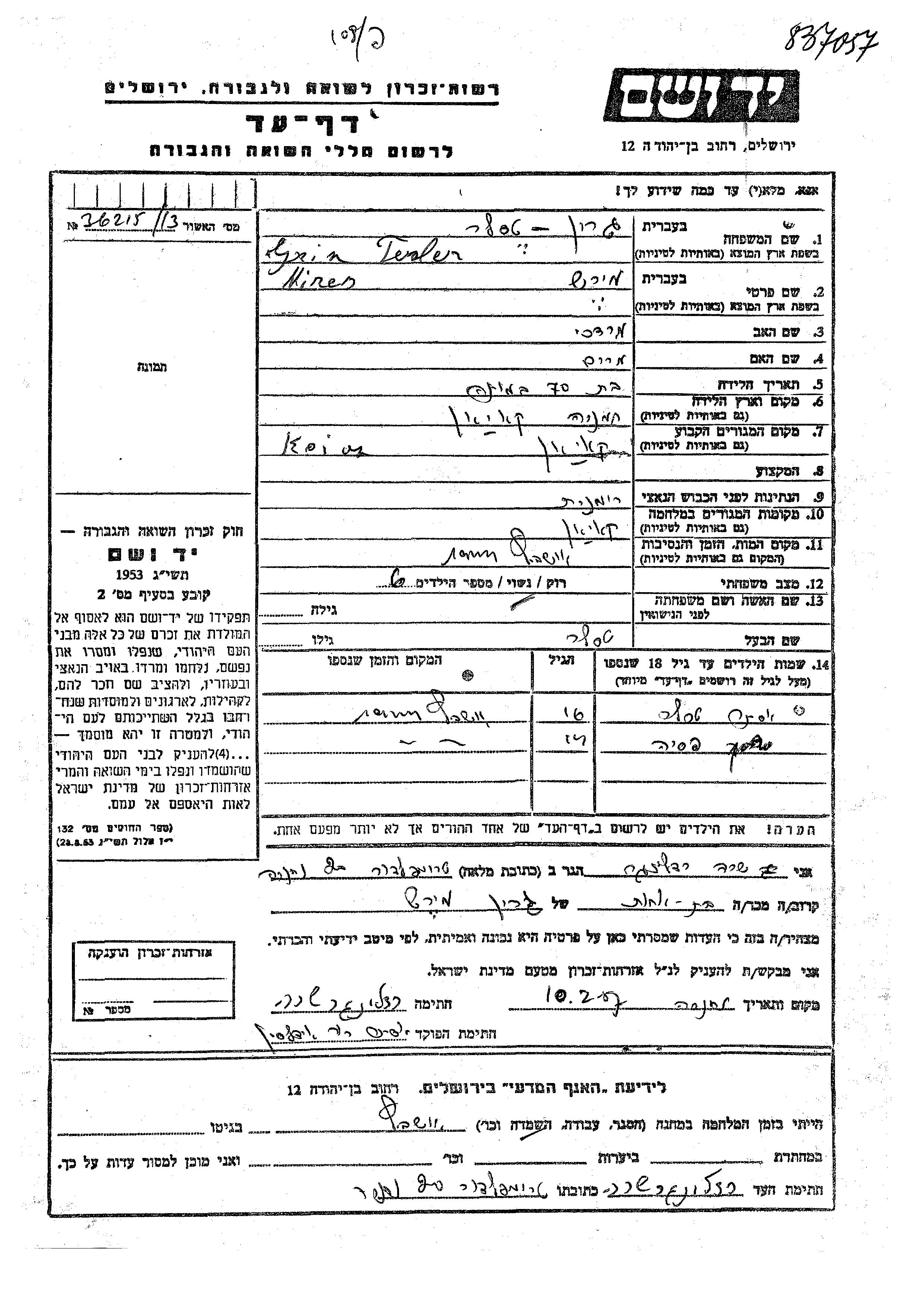 Яд Вашем - Листы свидетельских показаний Мемориального фонда