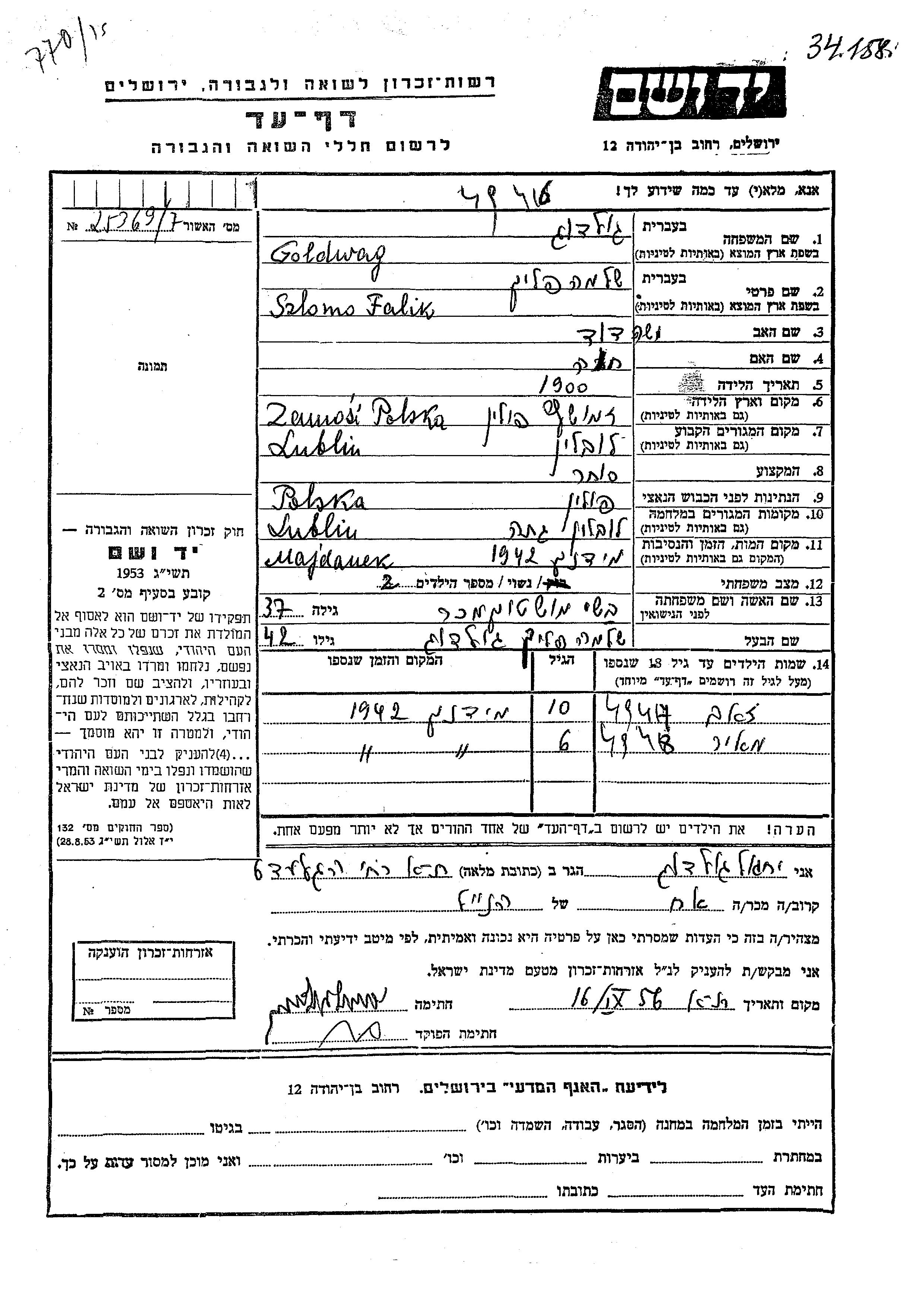 Гольдваг Гольдуг Зеев Люблин, Польша Лист свидетельских показаний