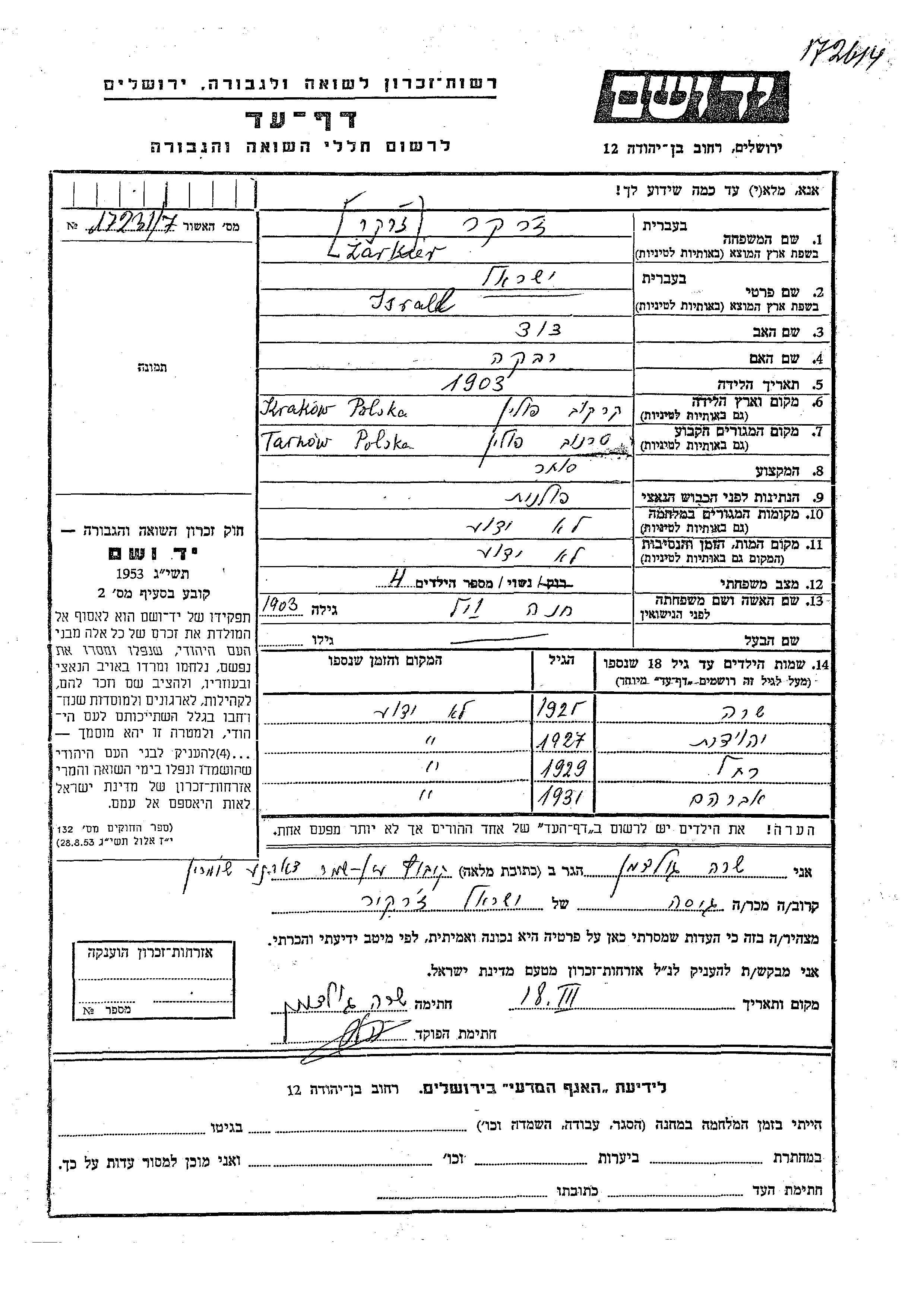 Заркер Сара 1925 Краков, Польша Лист свидетельских показаний