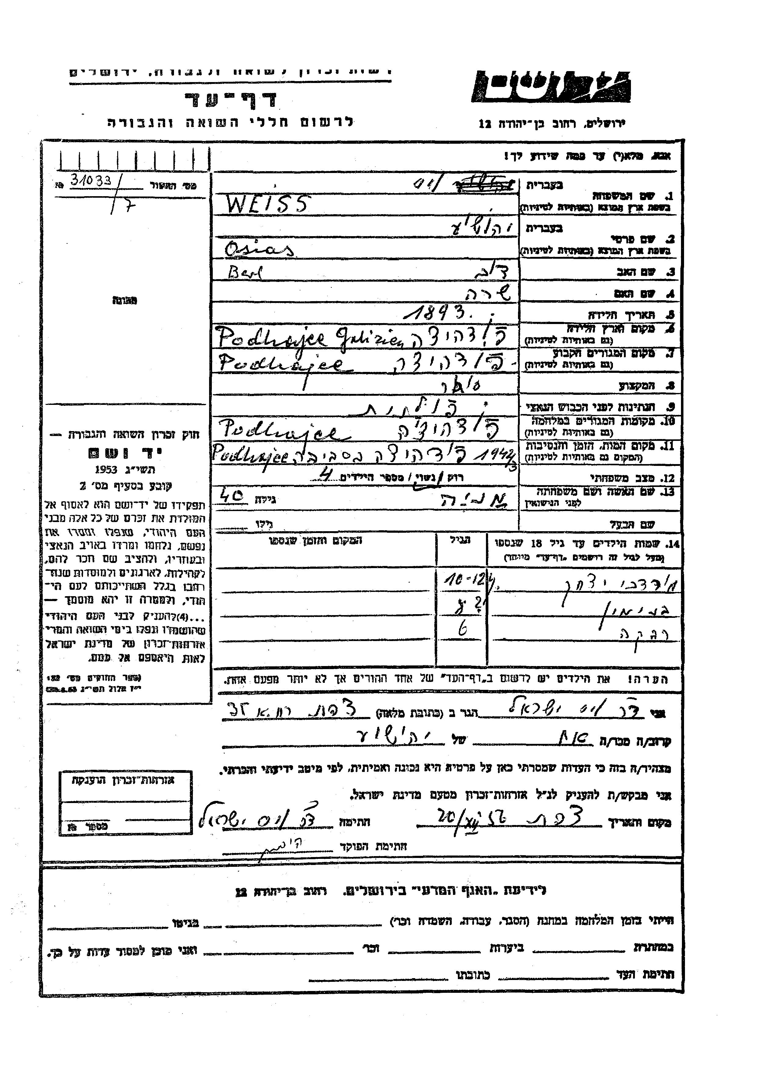 Вайсс Ривка Подгайцы, Польша Лист свидетельских показаний