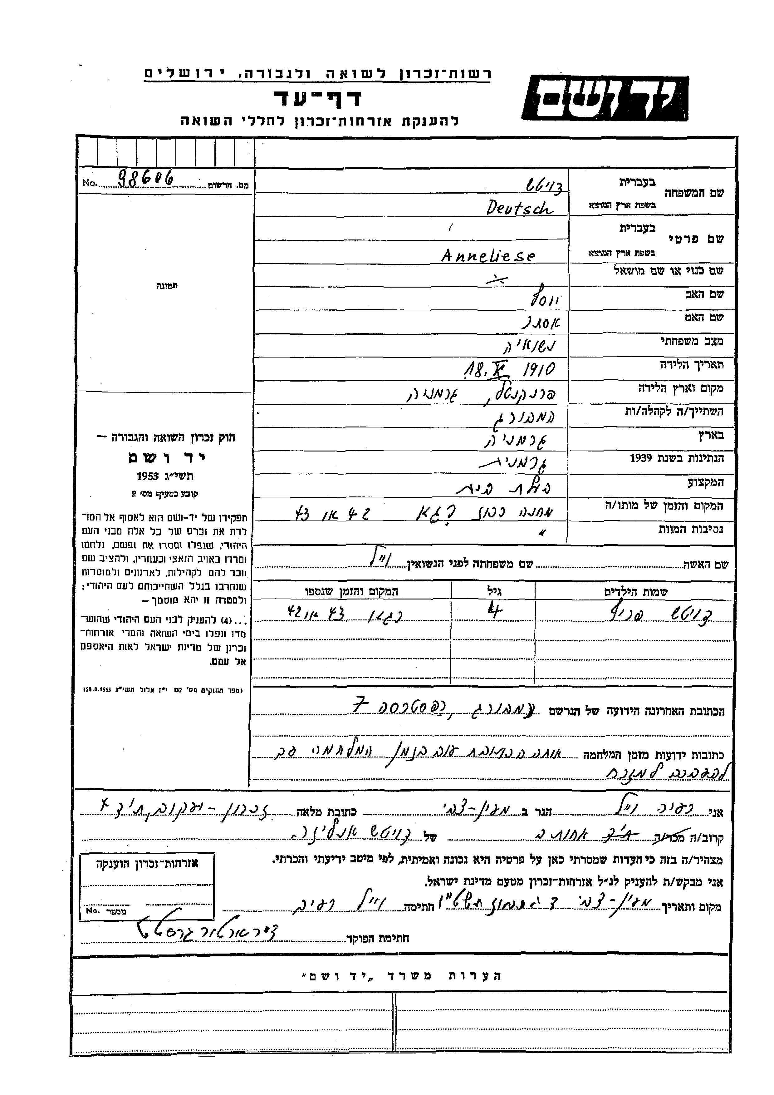 Яд Вашем - Листы свидетельских показаний Мемориального фонда