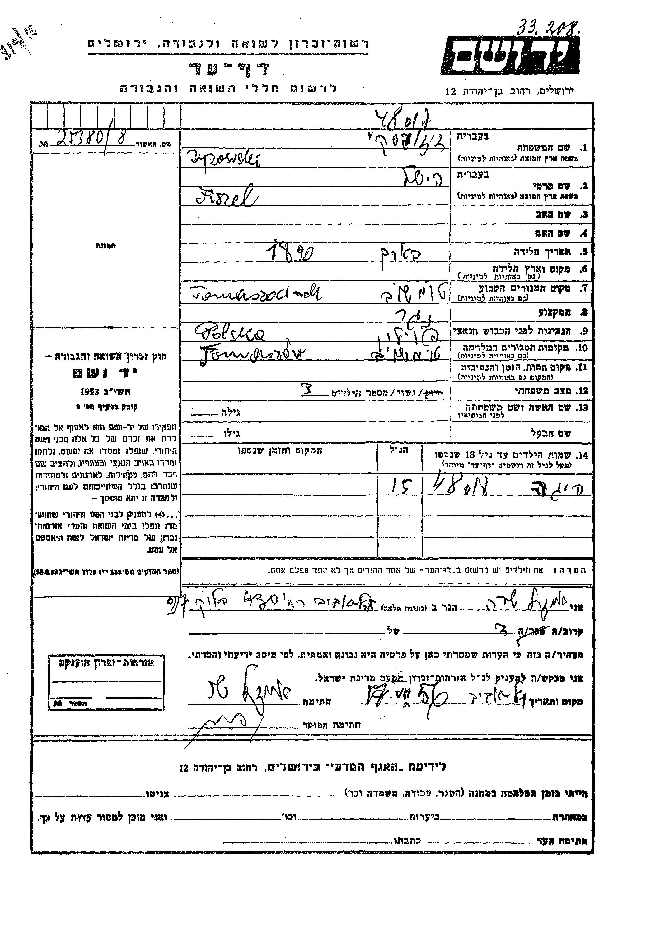 Яд Вашем - Листы свидетельских показаний Мемориального фонда