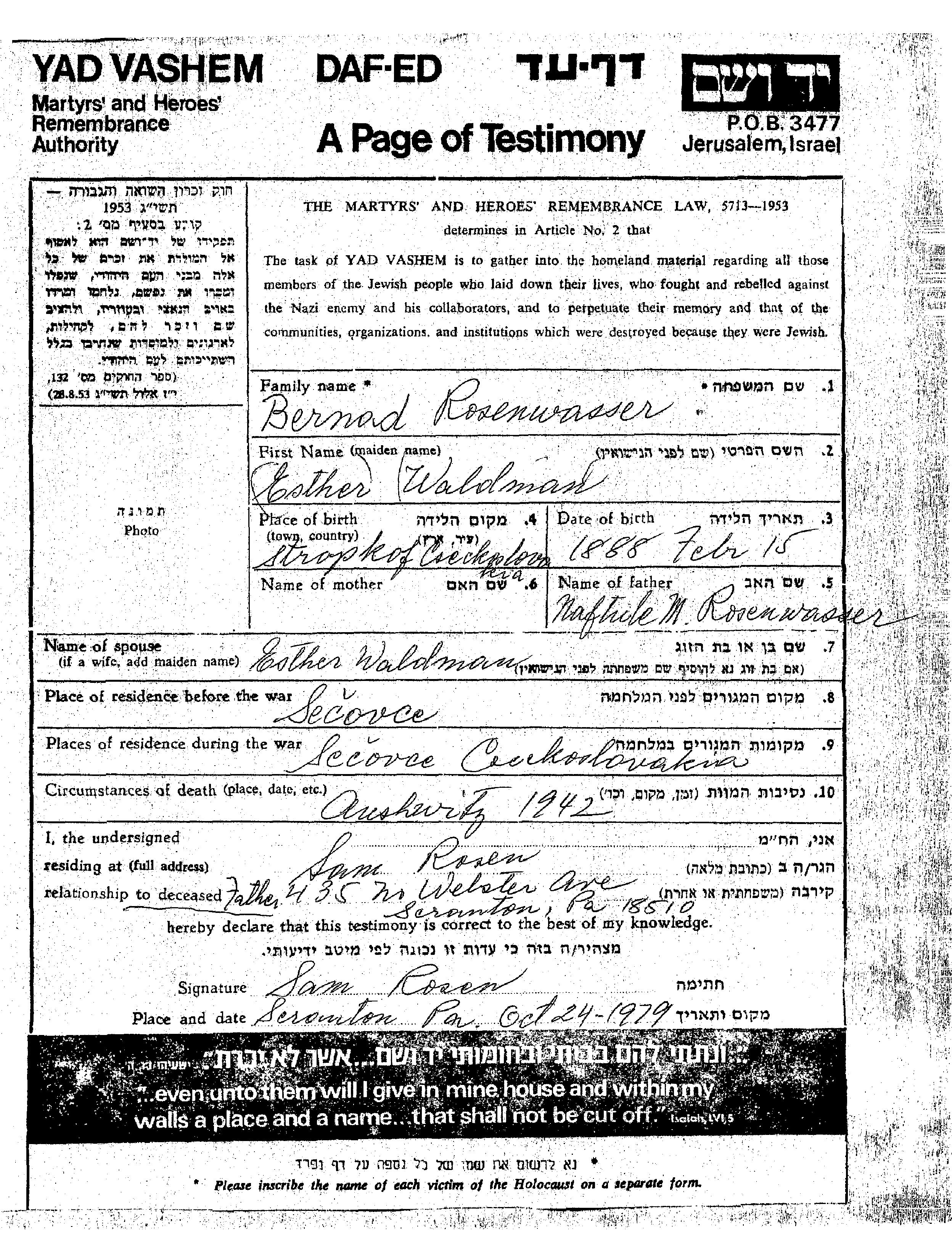 Бернад Розенвассер, место рождения: Стропкофф, Чехословакия. Отец: Нафтула М. Женат / замужем. Место жительства до войны: Сечовце, Чехословакия. Место во время войны: Сечовце, Чехословакия.