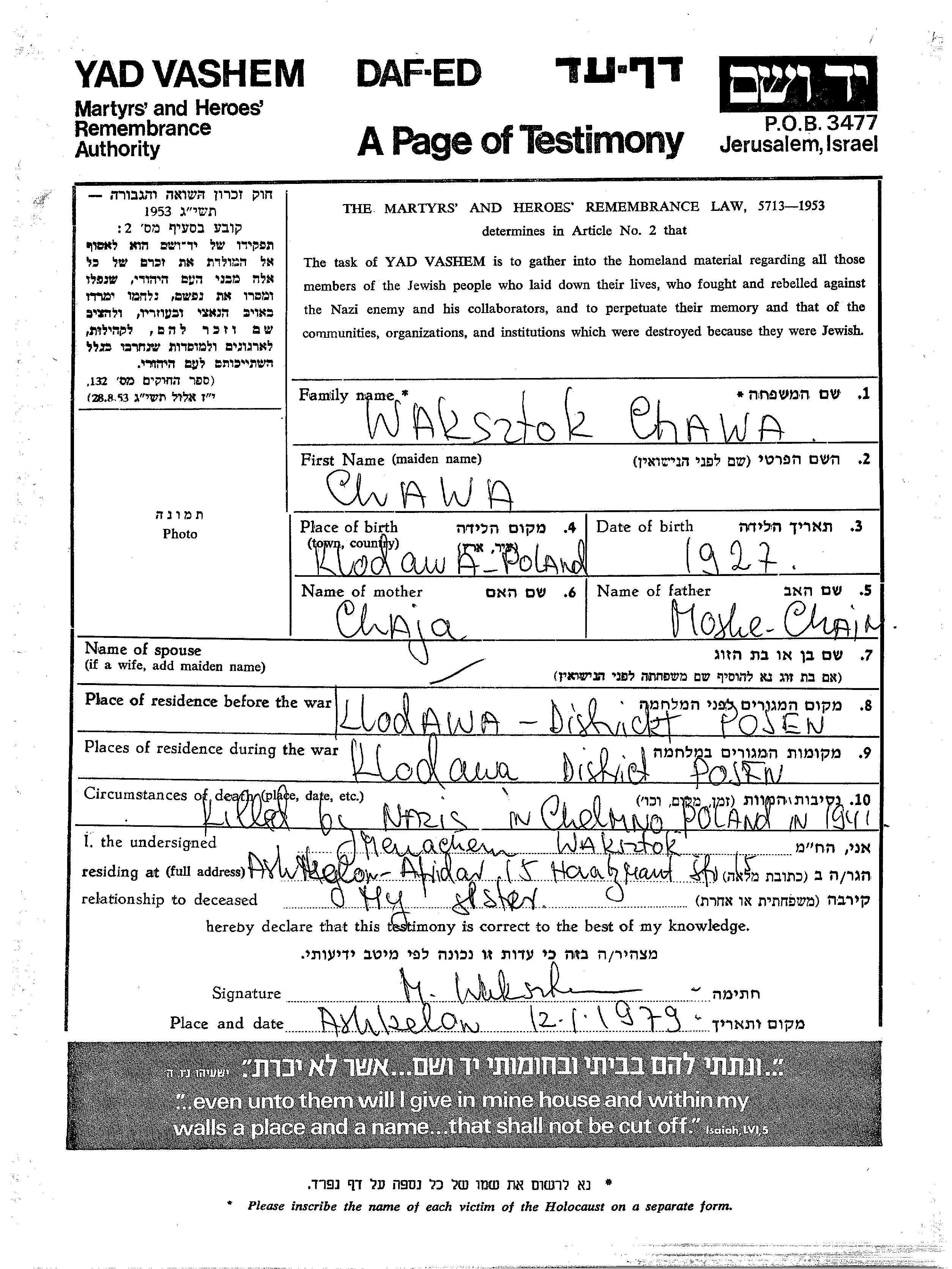 Хава Вакшток, место рождения: Клодава, Польша. Отец: Моше Хаим, mать:Хая. Место жительства до войны: Клодава, Польша. Место во время войны: Клодава, Польша.