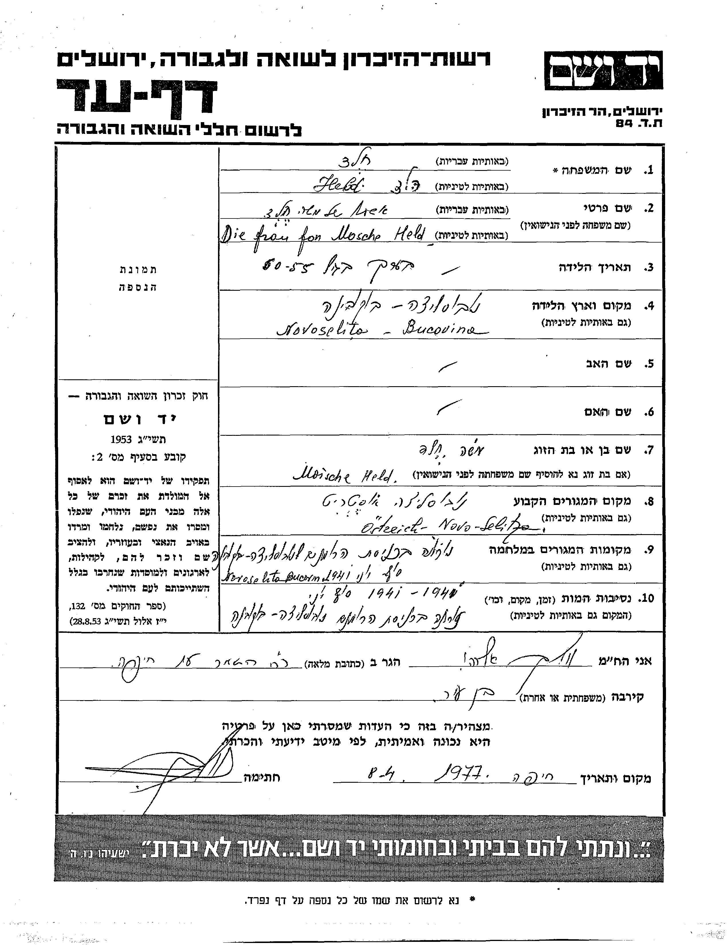 Халд Имя неизвестно Новоселица, Румыния Лист свидетельских показаний