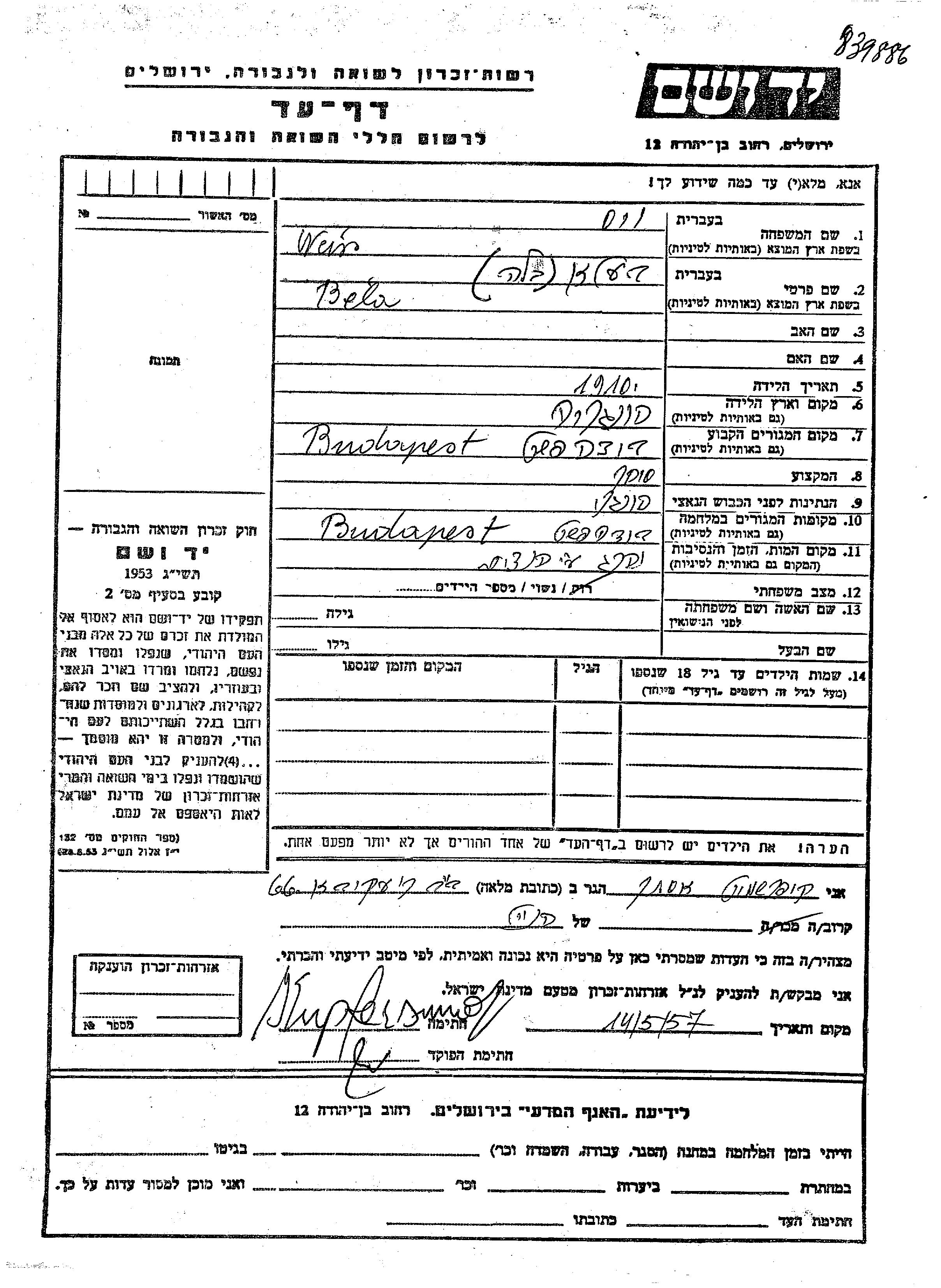 Бела Вейс, место рождения: Венгрия. Торговец / торговка. Женат / замужем. Место жительства до войны: Будапешт, Венгрия. Место во время войны: Будапешт, Венгрия.