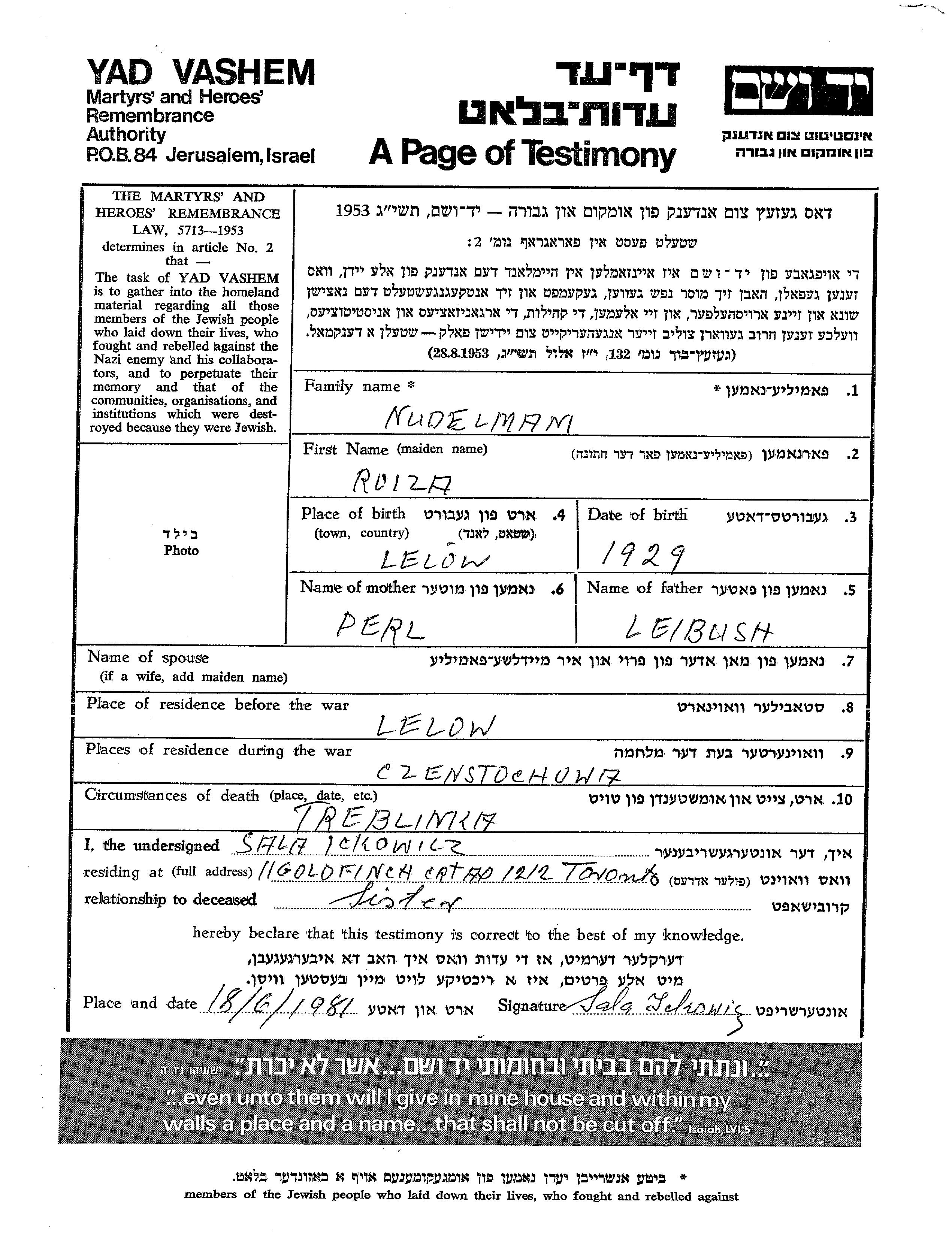 Нудельмани Ройза 1929 Лелув, Польша Лист свидетельских показаний