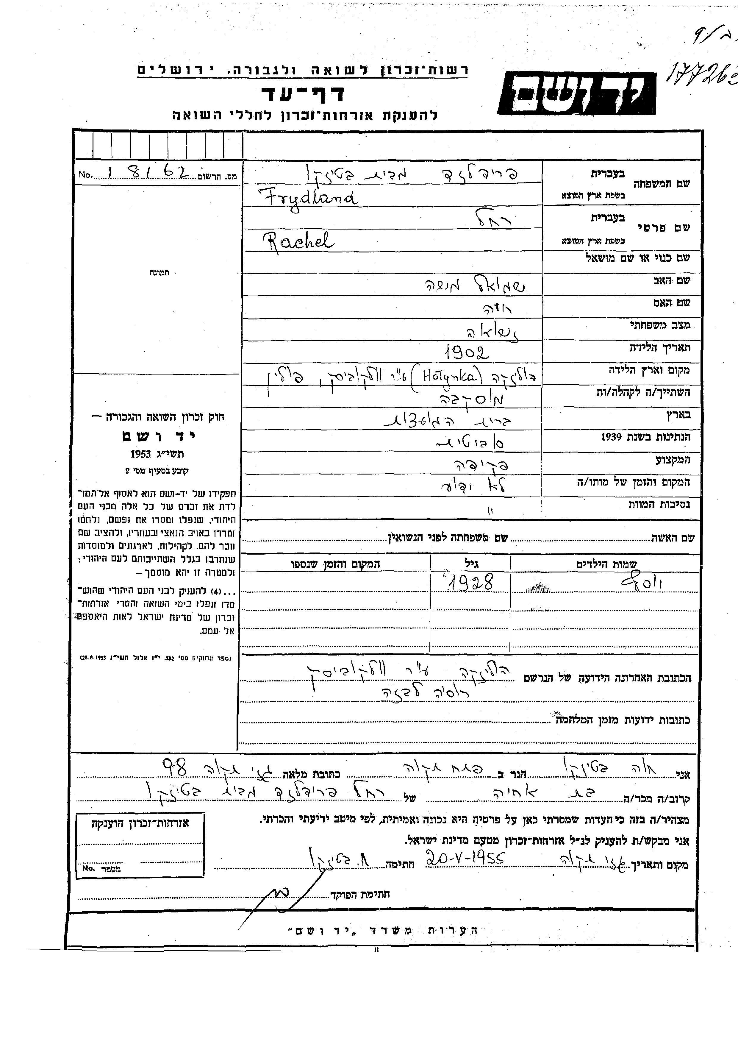 Фридланд Иосеф Москва, Россия (СССР) Лист свидетельских показаний
