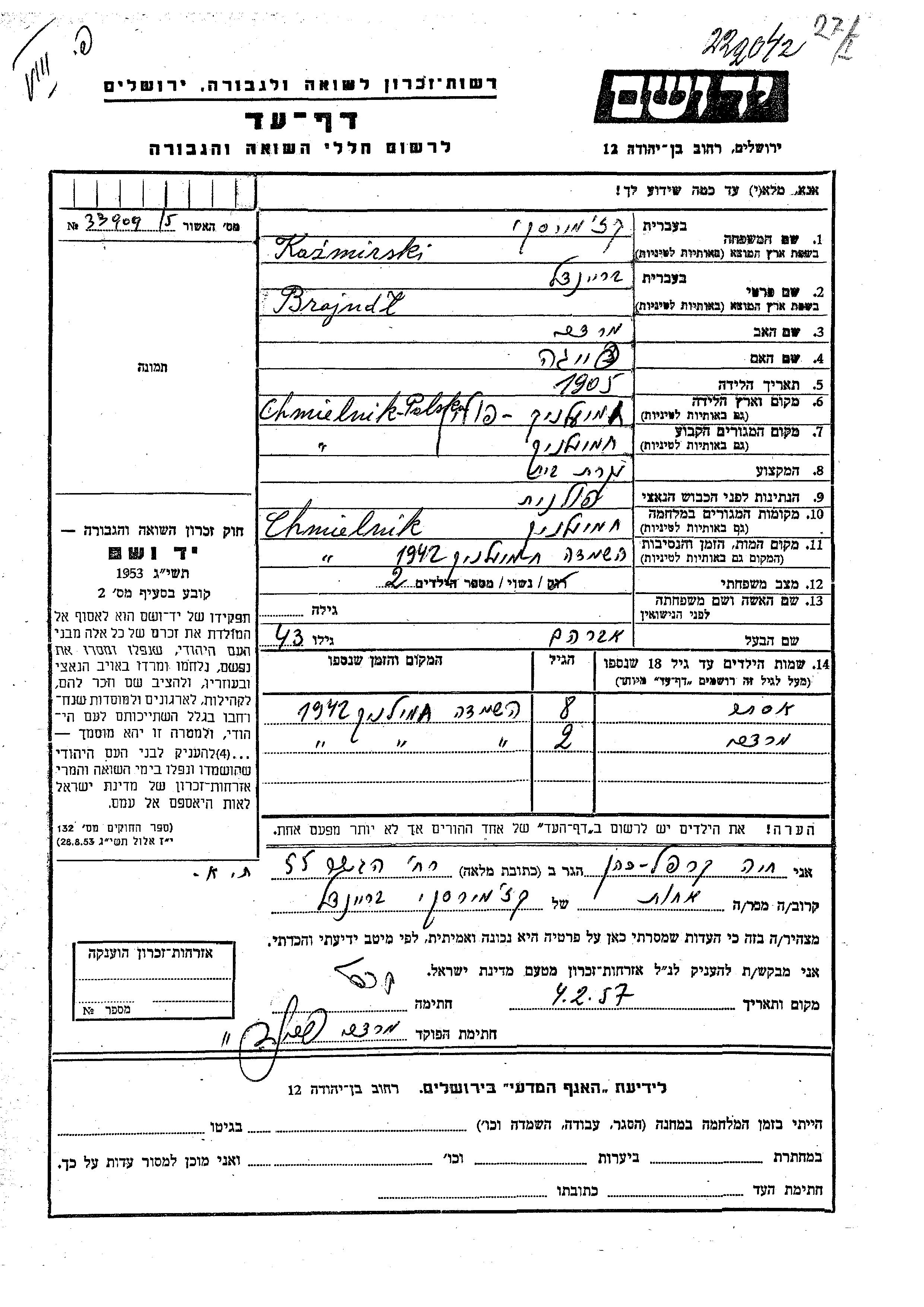 Мордехай Казимирски Авраам Брайндл. Ребенок. Место жительства до войны: Хмельник, Польша. Место во время войны: Хмельник, Польша.