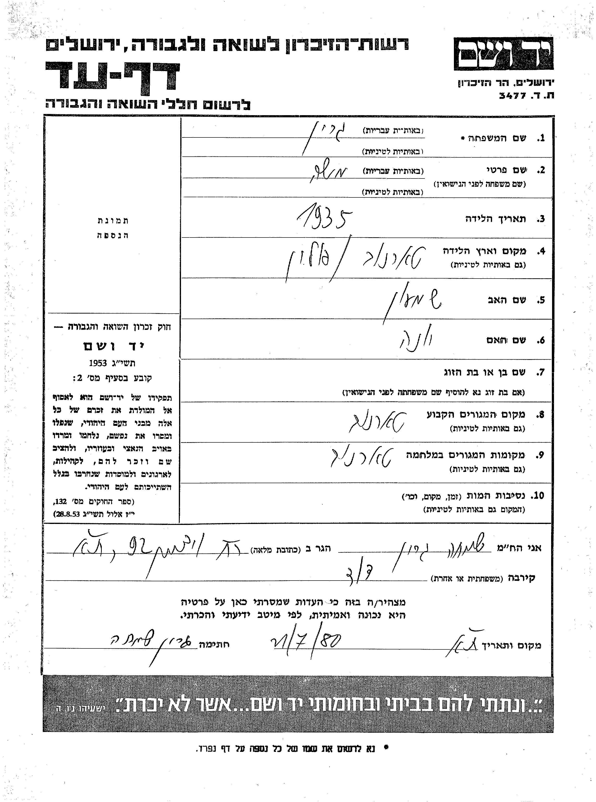Грин Моше 1935 Тарнув, Польша Лист свидетельских показаний