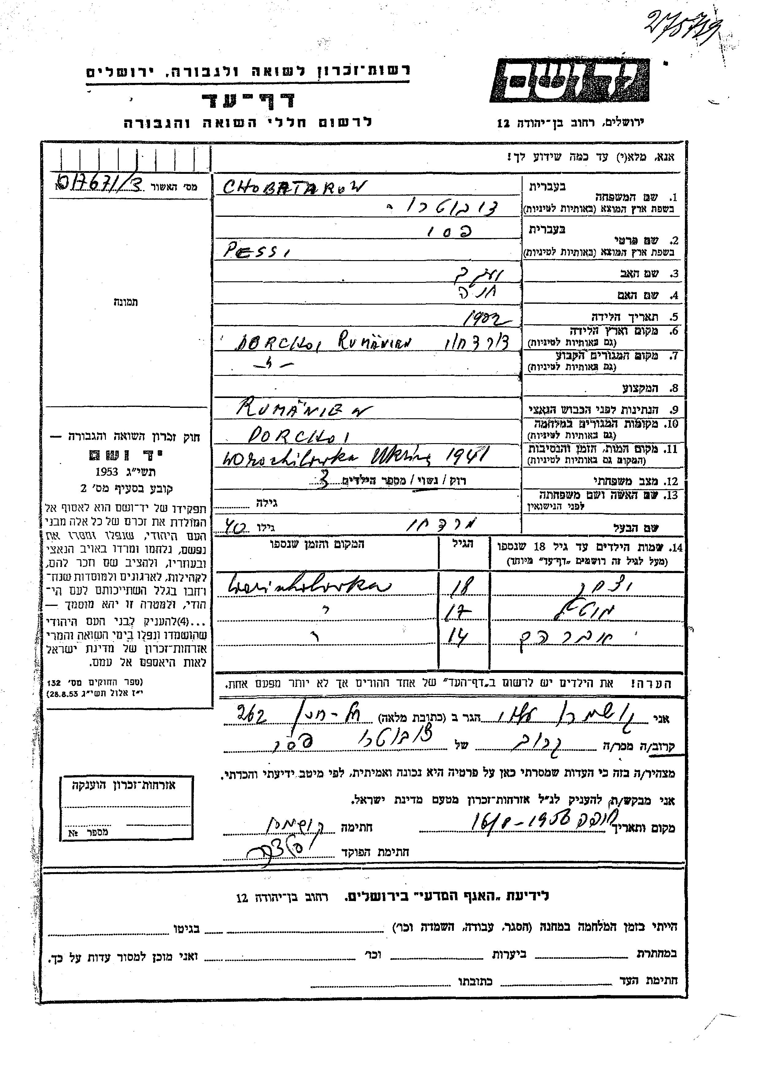 Ицхак Чобатаров Чуботару Мордехай Песси. Ребенок. Место жительства до войны: Дорохой, Румыния. Место во время войны: Дорохой, Румыния.